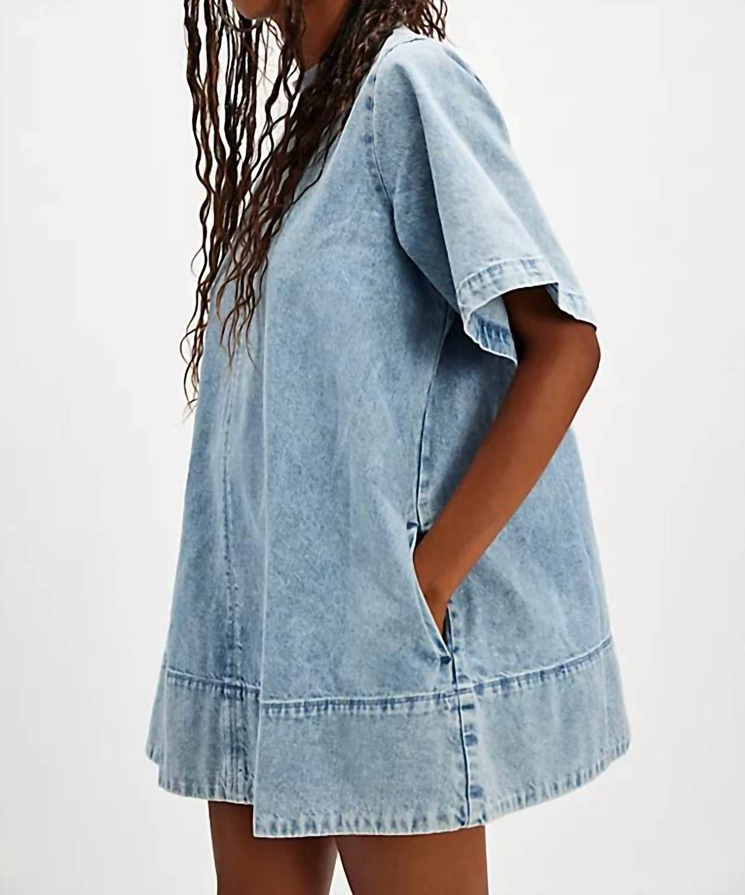 The Harlow Mini Dress by Free People in Ocean Blue is a chic option for your casual collection, boasting short sleeves and a soft denim fabrication. Crafted from 100% Cotton, this shift-style mini dress features a 33.5-inch length and is complete with a ribbed crew-neckline and defined seaming. Made for convenience and style, it includes a handy zip closure at the back of the neck. Designed for easy care, simply machine wash it when necessary.