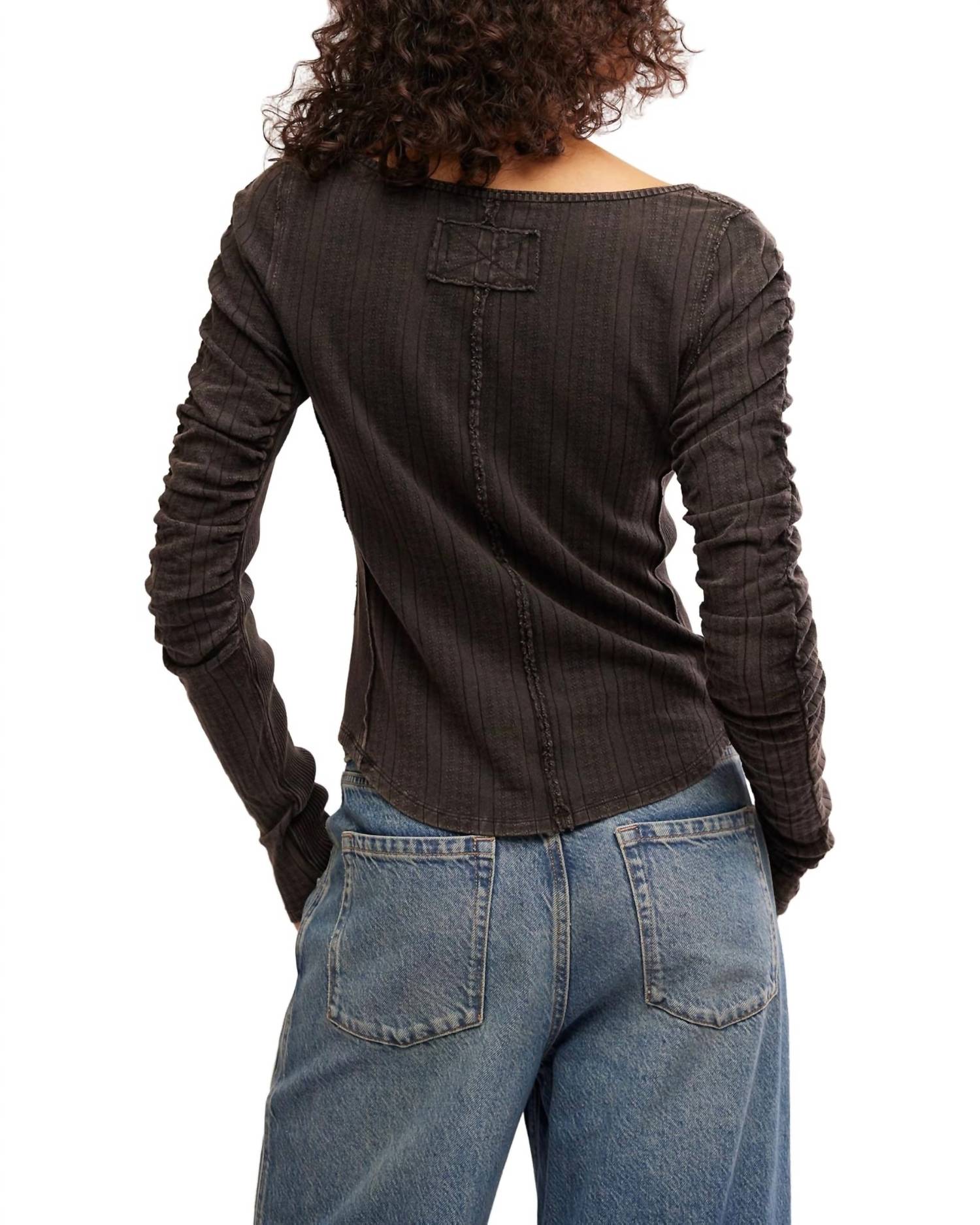 A long sleeve top you can wear with denim, skirts, well... just about anything! Discover the timeless charm of the Women's Hope Henley T-shirt by Free People, a wardrobe staple crafted from 100% cotton for ultimate comfort and breathability. This black textured top features a scoop neckline, long sleeves, and a button front placket, seamlessly combining style with functionality. The unique curved hem and exposed seam detail add a touch of flair to your outfit, making it perfect for layering or wearing on its own. Care is a breeze with machine wash instructions, ensuring easy maintenance for everyday wear.