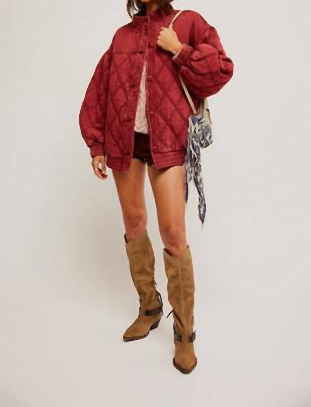 Nothing is cooler than this vintage inspired bomber jacket. Introducing the Juno Jacket by Free People, a statement piece in rich Port that epitomizes laid-back luxury. With its long, extra wide puff sleeves and quilting throughout, this oversized bomber jacket is perfect for layering. Crafted from 100% cotton, it features a stand collar and a secure zip closure with a button placket. Machine wash cold. Imported.