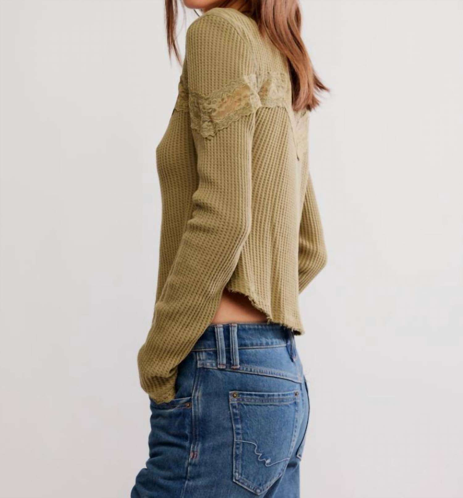 Throw this adorable cardigan over any cami or tank top. Meet the Let's Party Cardigan by Free People, a must-have for your fall festivities in chic Gothic Olive. Crafted with a waffle-knit texture and elegant lace trims, this cardigan boasts long, fitted sleeves and a square neckline for a feminine touch. Made from 100% cotton, it features a button-front closure and measures 29 inches in bust, 21.5 inches in length, and 25 inches in sleeve length in size small. Care: Machine wash cold.