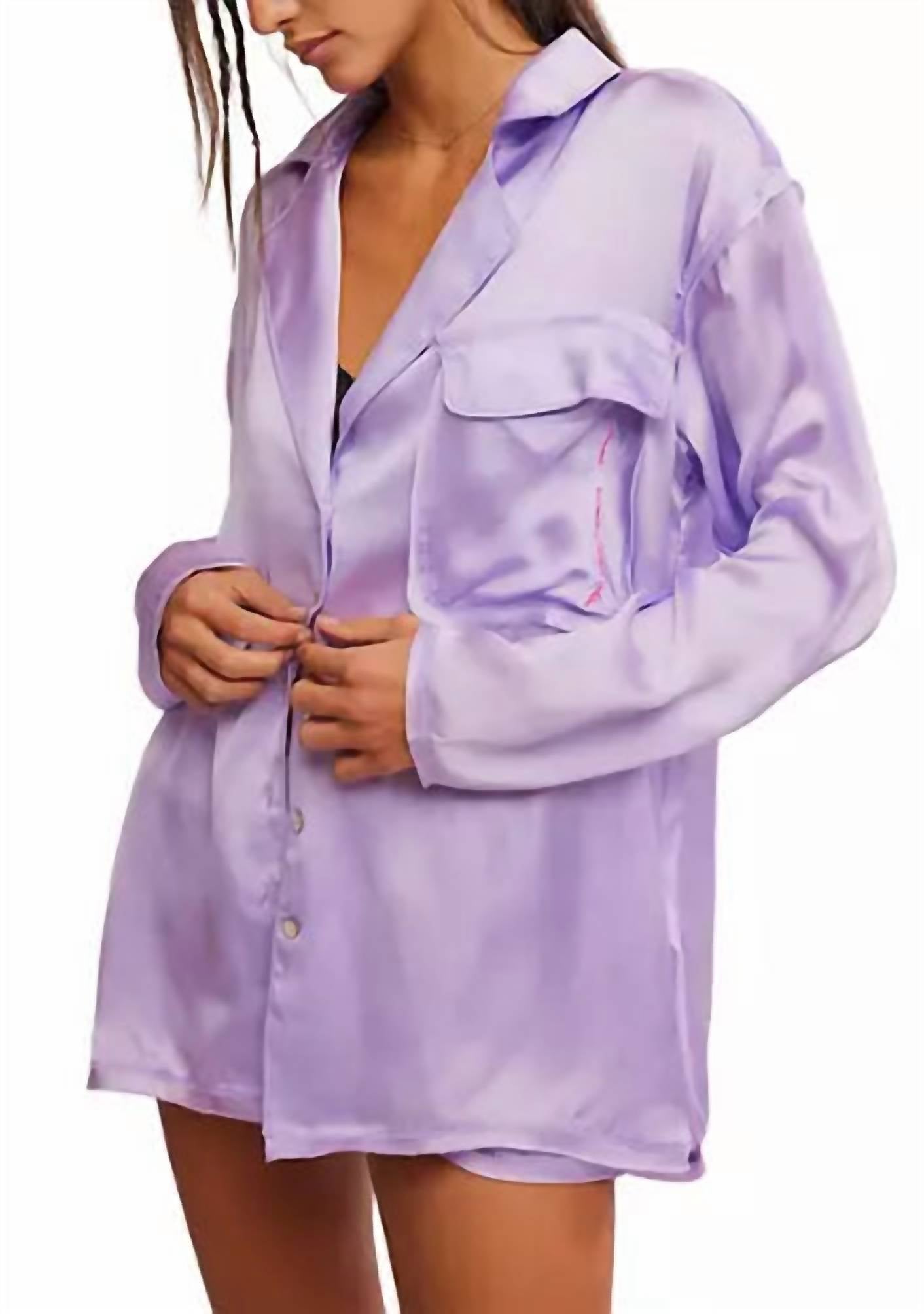 Pair with cozy slippers for pajama perfection. Introducing the Like Honey Pajama Shirt by Free People in a serene Orchid Bloom hue, perfect for a relaxing evening or vacation getaway. Designed with long sleeves and crafted from 100% soft polyester, this slightly oversized PJ top offers a billowy fit. It features a notched collared neckline and a button-down front, adorned with a chic chest pocket and exposed seams for added character. Origin: Imported. Care: Machine wash cold for easy maintenance.