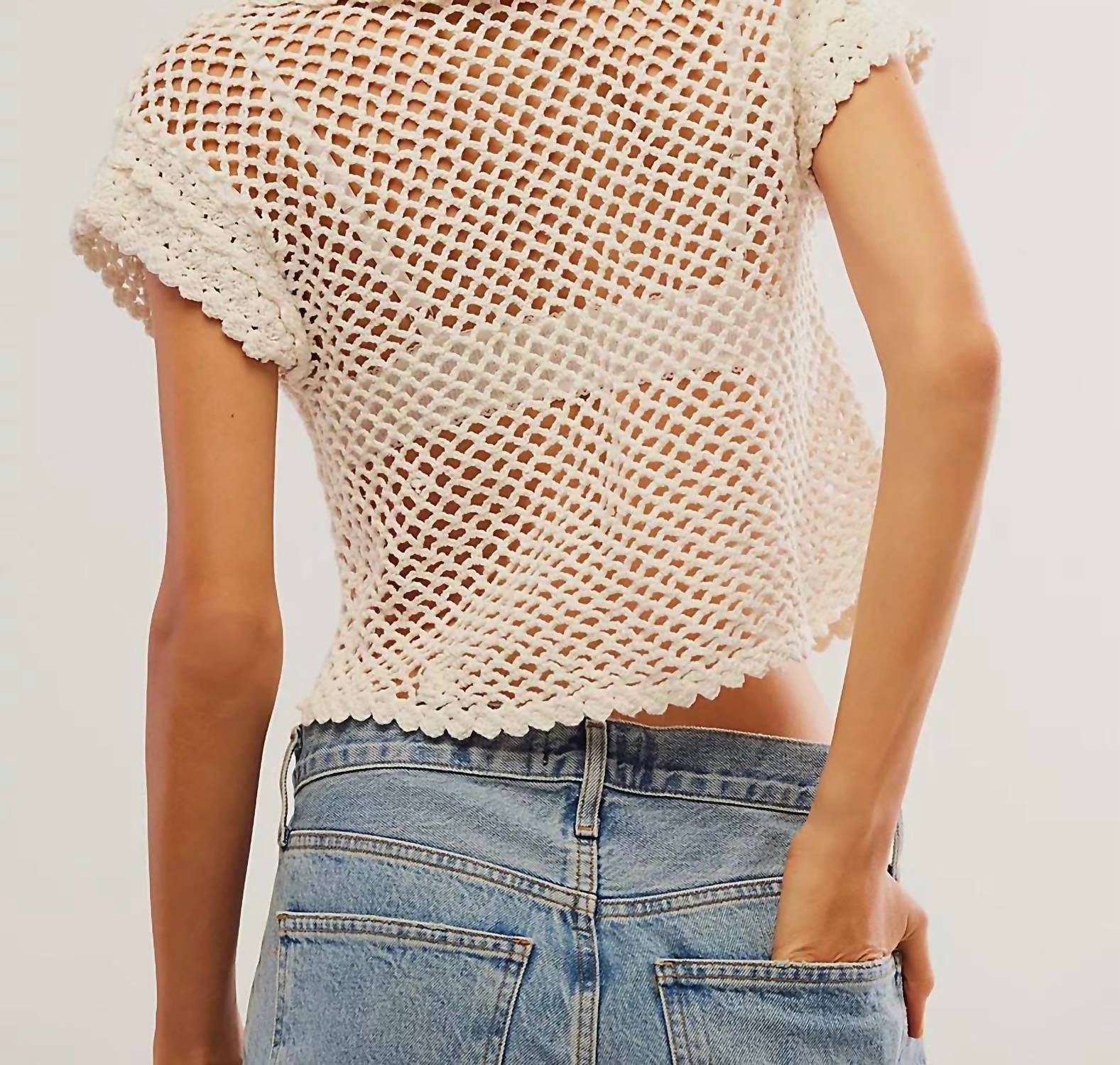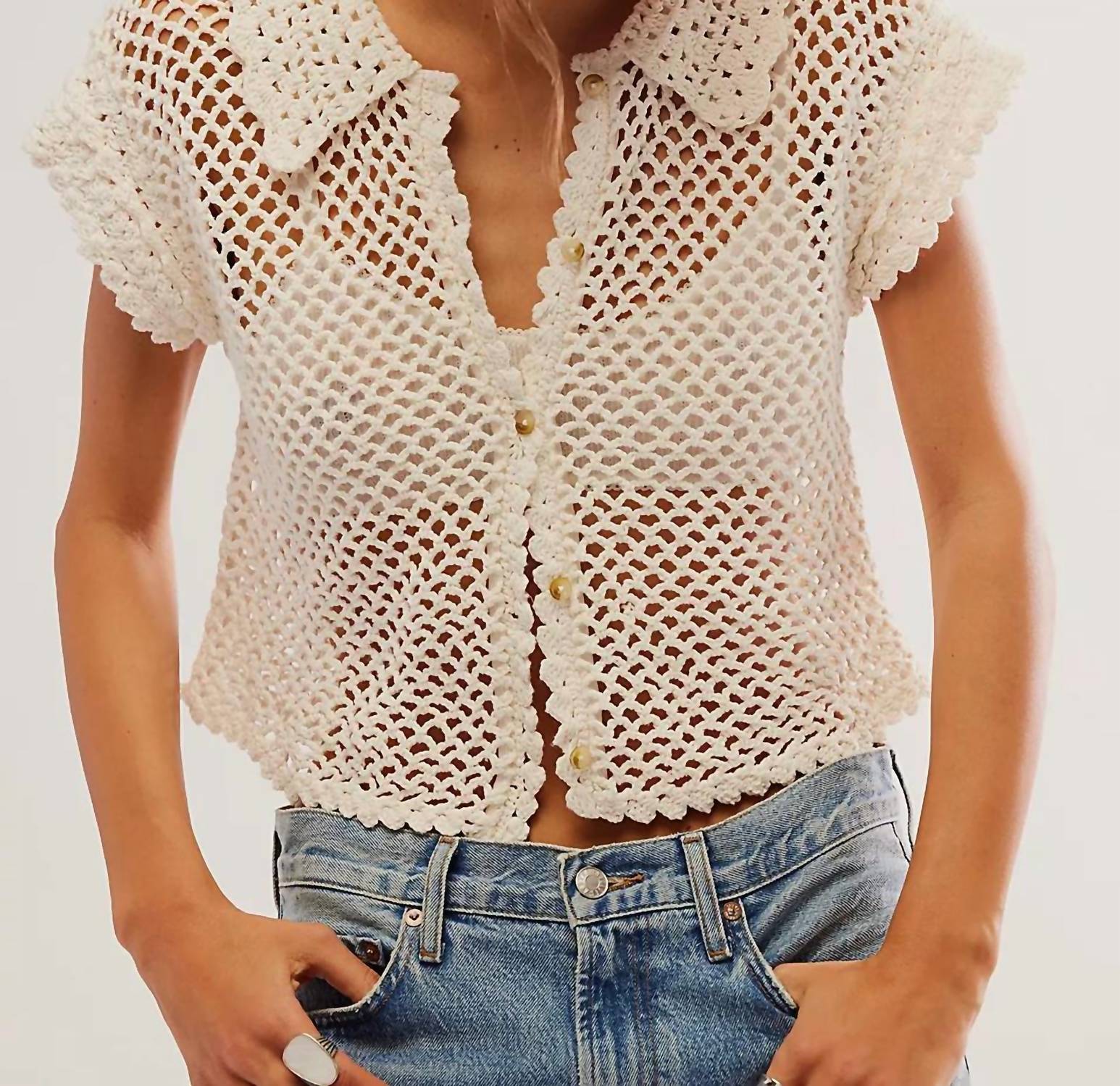Pair this with your favorite jeans and slides for your next girls night out. Elevate your summer wardrobe with the Lily Crochet Top by Free People, a chic garment in the soft shade of Coconut Milk. This textured, short-sleeve blouse flaunts intricate crochet detailing for a breathable fit, making it perfect for beach days or semi-formal gatherings. Material: Cotton. Closure: Button closure. Care Instructions: Hand wash and lay flat to dry.