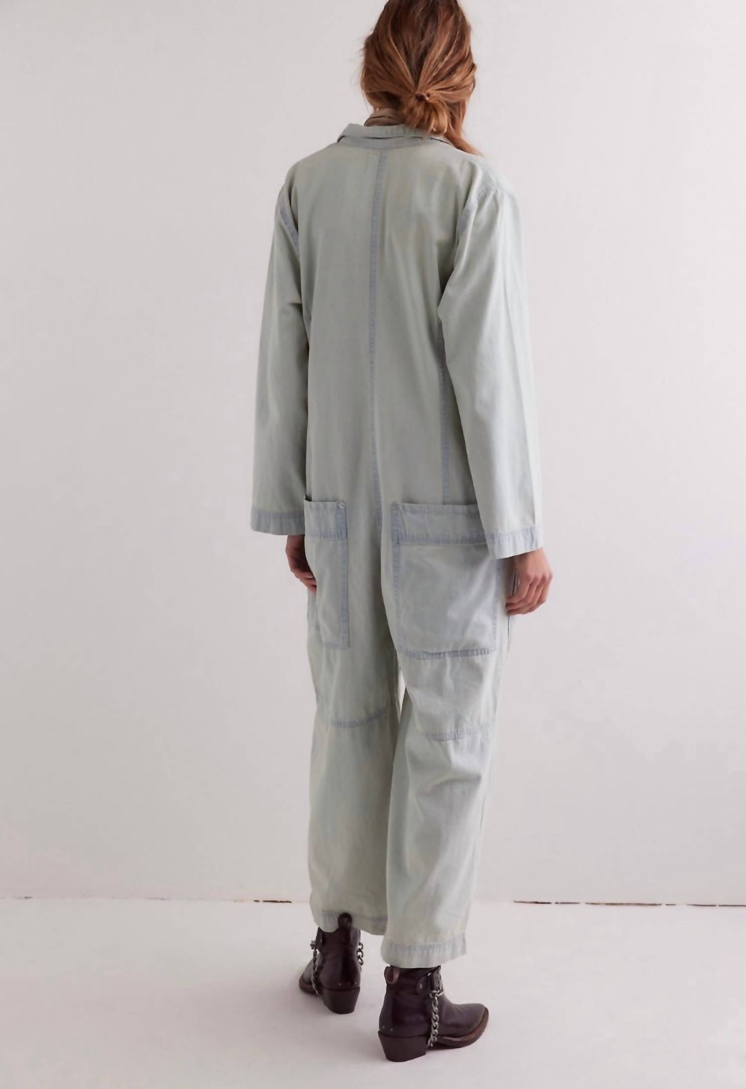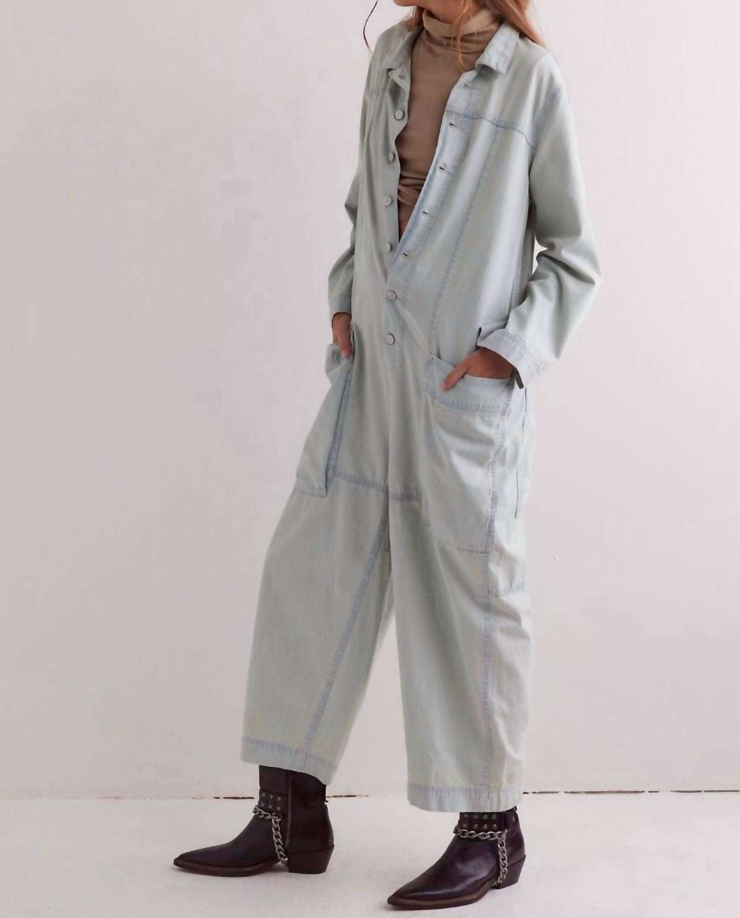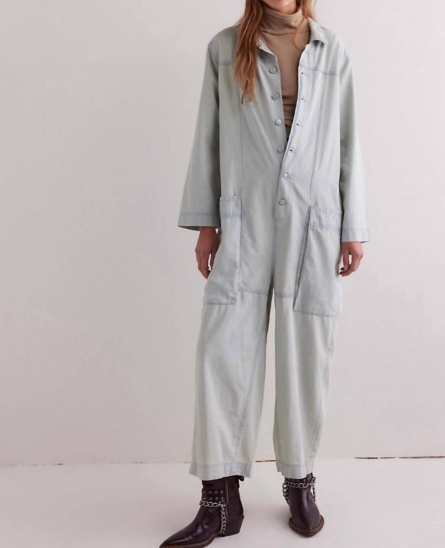 The perfect outfit choice when you you need something quick to throw on and still want to look efforlessly cool. Introducing the Margarita Jumpsuit by Free People, a light blue staple from the We The Free collection. Crafted from 100% cotton, this utility-inspired piece features a shapeless, wide-leg fit with a classic collared neckline and side pouch pockets. Originating from China, it secures with front button closures and flaunts a rigid denim material in a solid light wash. Effortlessly style it for any occasion, and maintain its appeal with a simple machine wash.