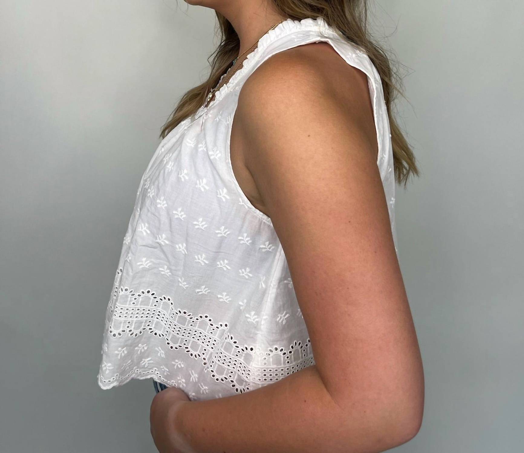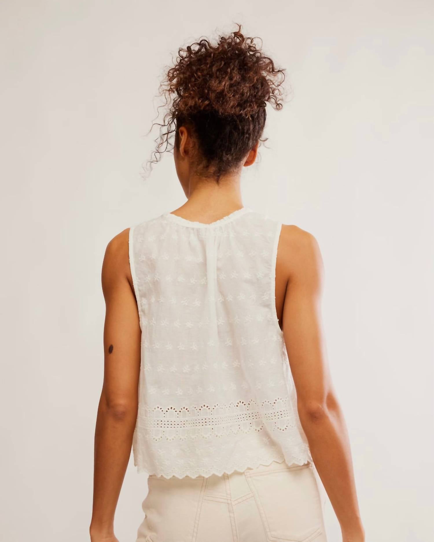 A timeless blouse that will never go out of style. The Free People Marina Eyelet Tank Top, in a refreshing Clean Ivory, is an ideal choice for those balmy summer days. This sleeveless style is crafted entirely from lightweight cotton, offering a textured, airy fit with its delicate eyelet detailing. Designed with a crewneck and convenient pull-on closure, it suits various casual outings like brunch or a relaxed summer holiday celebration such as Easter. For care, machine wash cold on a gentle cycle, use non-chlorine bleach only, line dry, iron on low, or consider professional cleaning services.