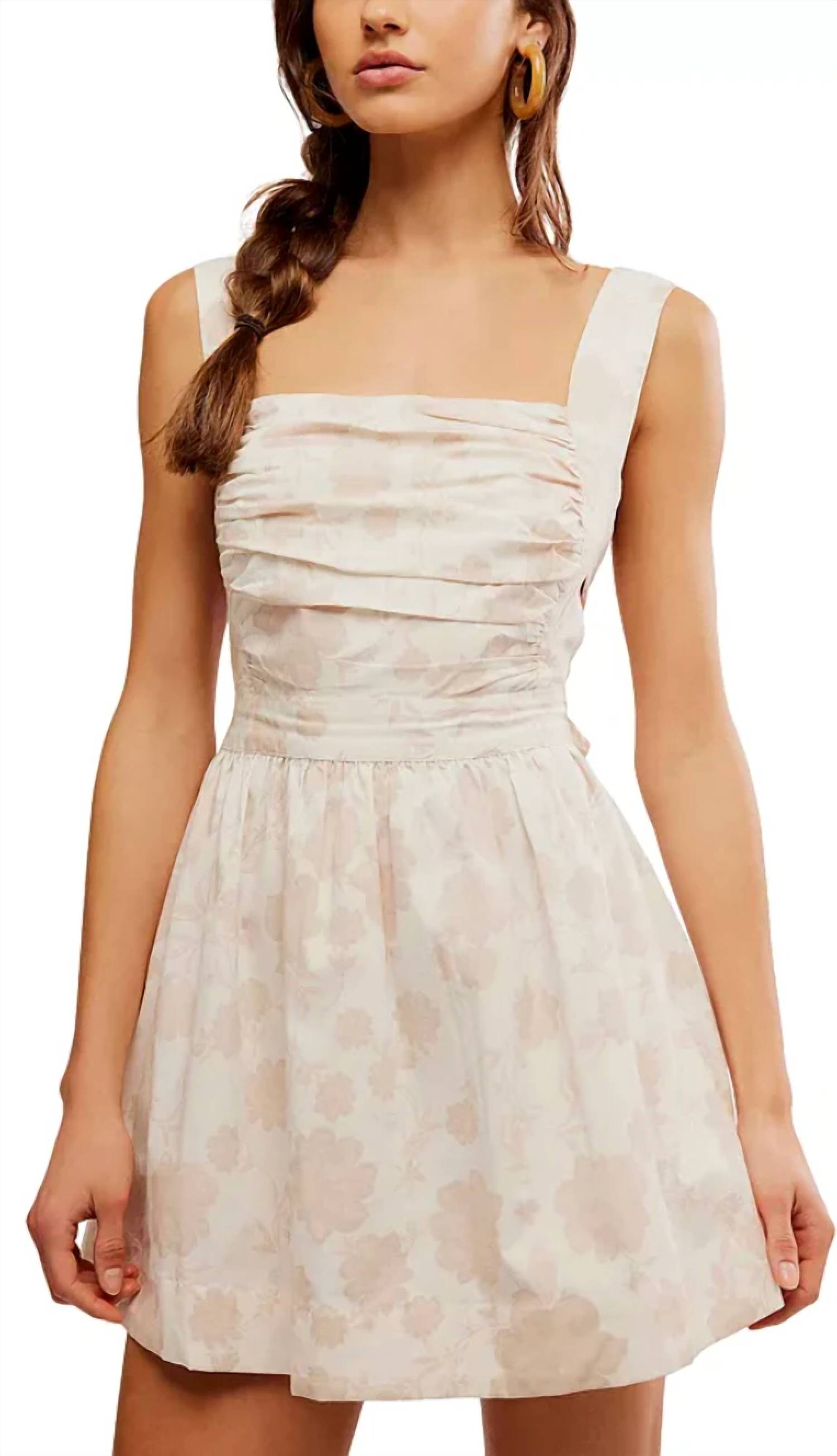 A short and breezy dress for those warmer days. Offers a fun and feminine touch with its soft floral driftwood cotton fabrication and flattering A-line silhouette. Featuring a square neckline, wide fixed shoulder straps, and a ruched bodice. Sleeveless mini dress is both chic and comfortable. Composed of 97% Cotton, 3% Elastane. Self-tying back closure. Machine wash cold. Measurements for size Small: Waist 26.75 in, Length 26 in. Perfect for a holiday party, especially for Thanksgiving gatherings.