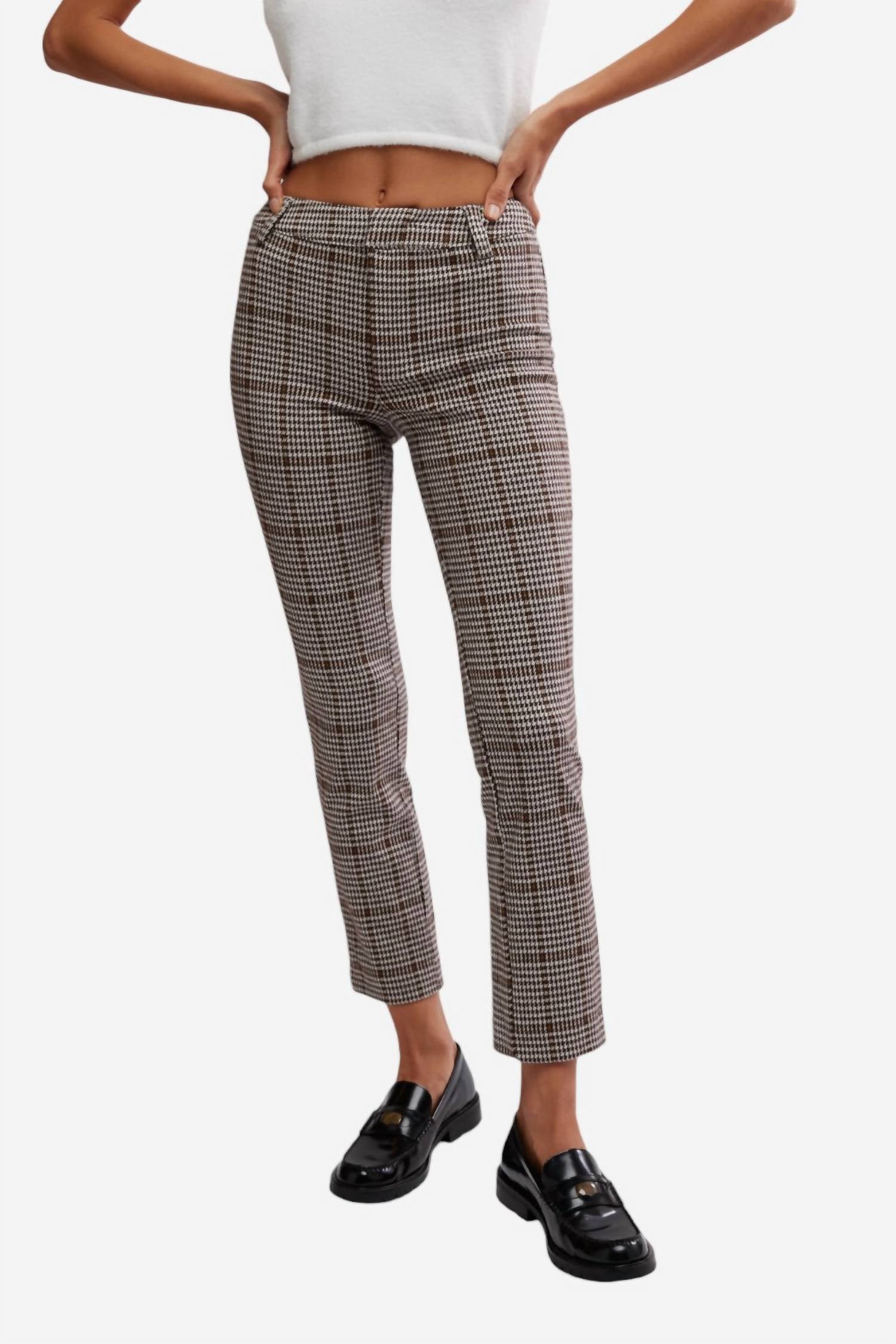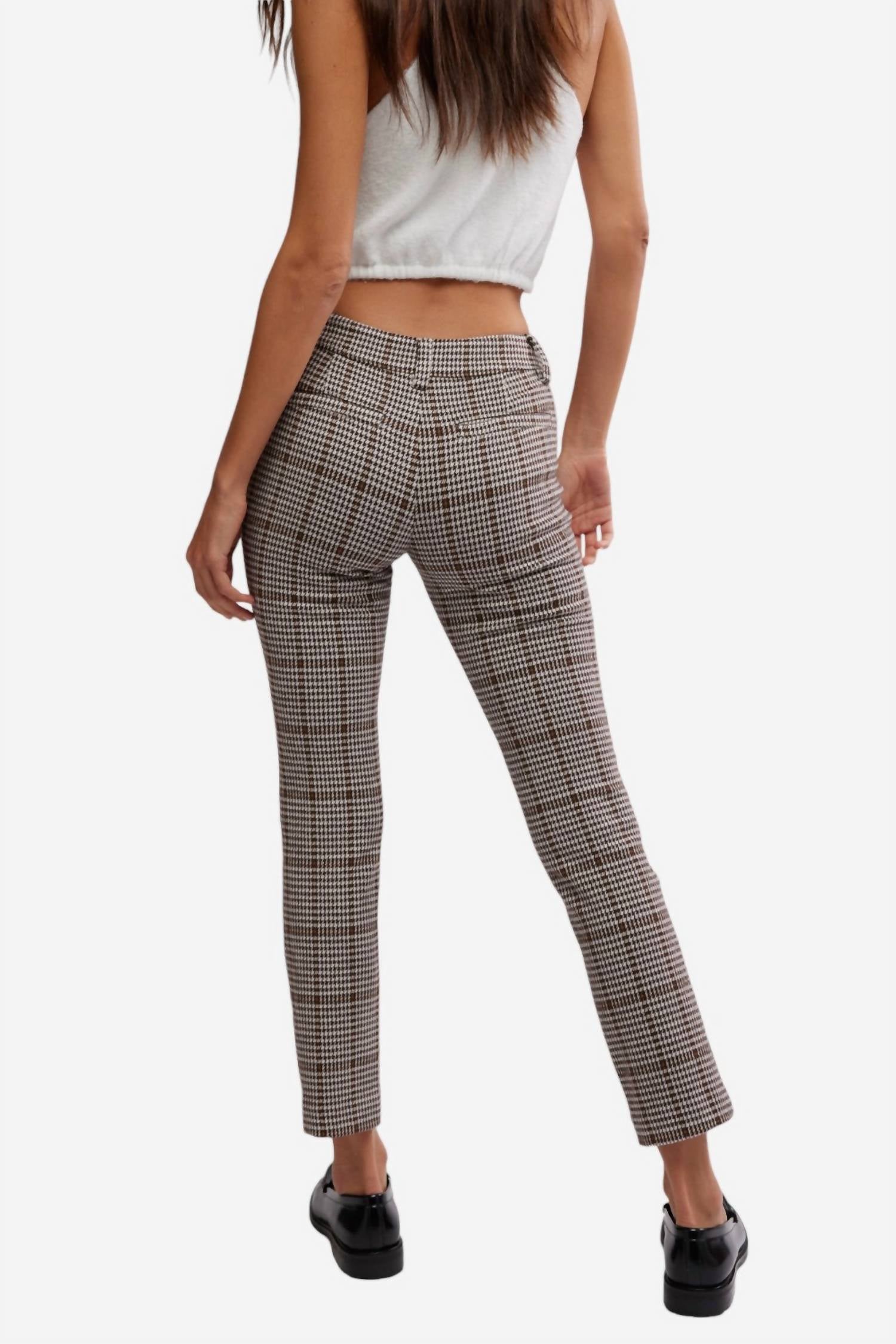 Introducing the Molly Plaid Slim Pant by Free People, a chic addition to your wardrobe in a stylish Neutral Combo. These women's trousers feature a mid-rise, ultra-slim silhouette with a skinny leg and classic plaid print throughout. Composition: 51% Polyester, 45% Viscose, 4% Elastane. Closure: Zip fly with hook and eye. Care: Machine wash. Perfectly paired with loafers for timeless elegance or mules for a sleek look, these pants offer a flattering fit with back jetted pockets and a cropped inseam.