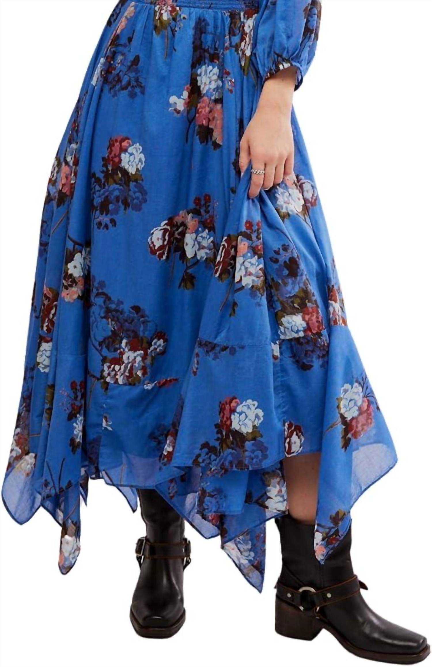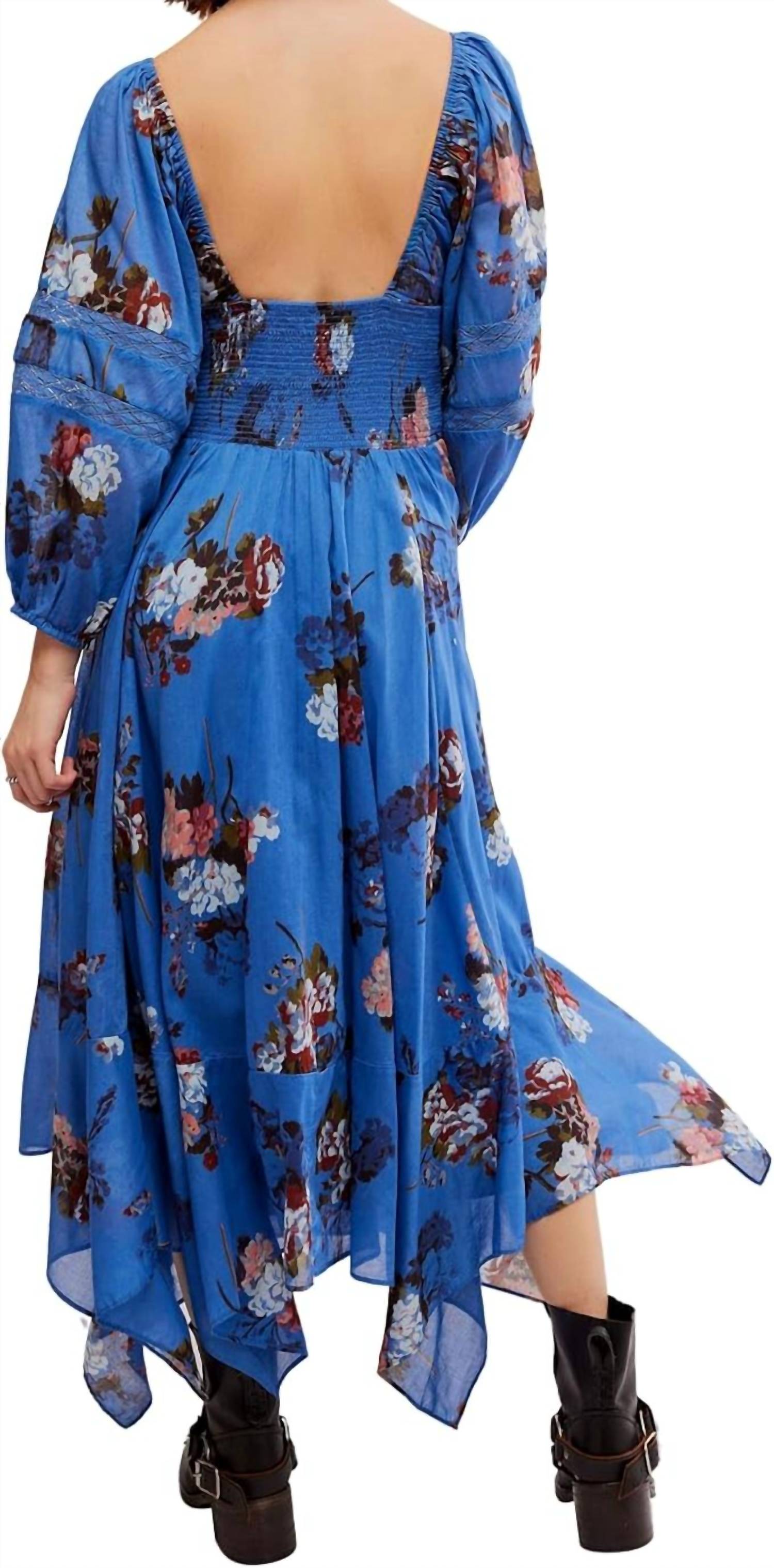 Meet the Morning Glory Floral Maxi Dress by Free People, an enchanting choice for a spring outing with its vibrant blue floral pattern. This dress boasts long balloon-inspired sleeves with elasticated cuffs, crafted from 100% cotton for a soft touch against the skin, and features a flattering fit-and-flare style with a smocked bodice. Closure: Pull on. Care: Machine wash cold. Measuring 51 inches in length and 27 inches in bust size for a size small, it's perfect for vacation or Thanksgiving gatherings with its low open-back and handkerchief hemline.
