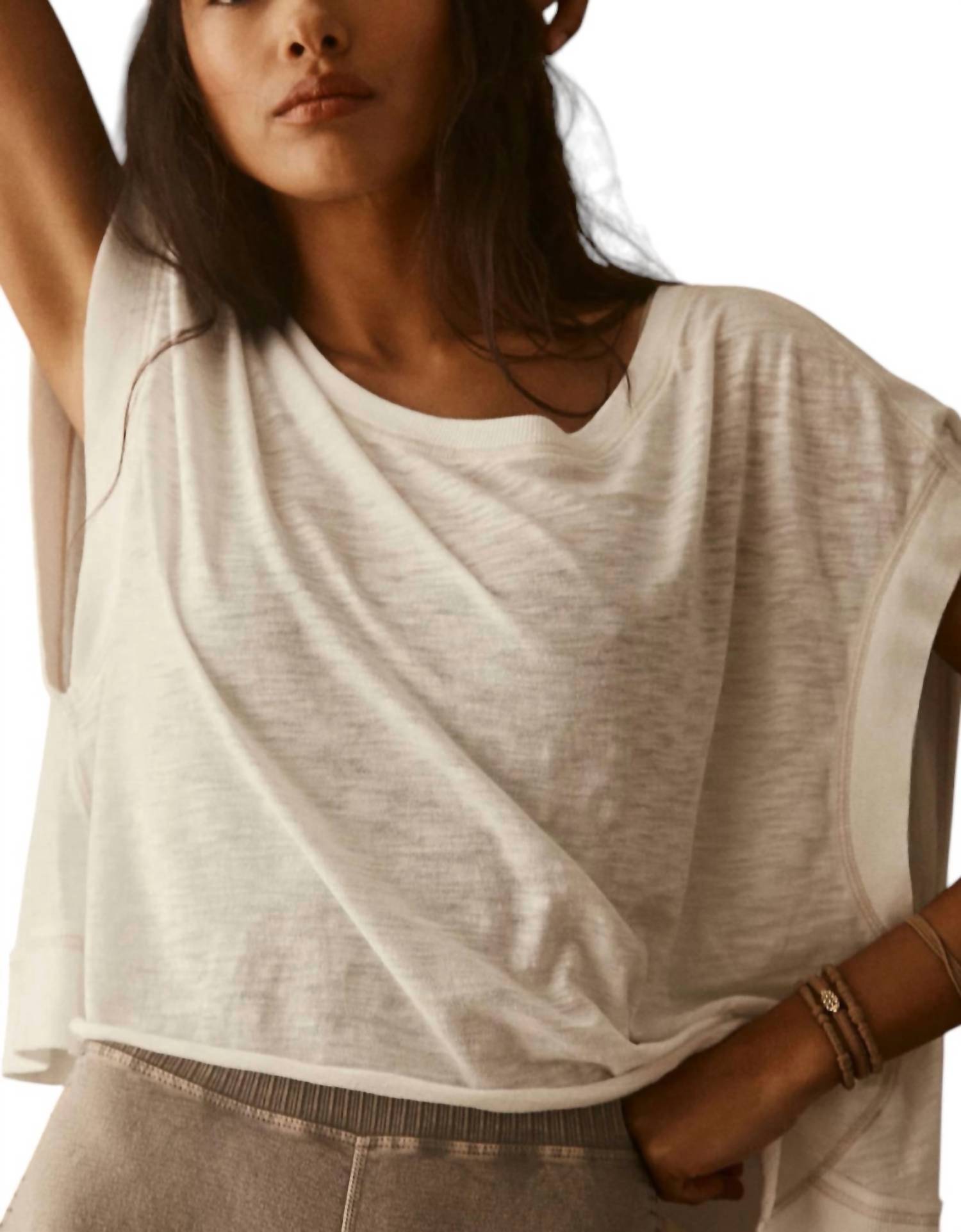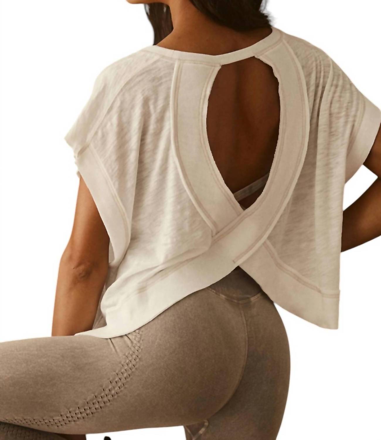 Pair this crop top with your favorite high-waisted jeans or maxi skirt. Step up your workout game with the My Time Tee Top by Free People, a perfect blend of style and functionality designed for the athleisure trend. With short dropped sleeves and a wide crewneck, this solid white tee combines a light and airy feel with a slouchy fit and a wrapped cutout back. Composition: 100% Polyester. Closure: Pull-on. Care: Machine wash. Ideal for fitness or workout sessions, this tee is your go-to summer activewear companion.