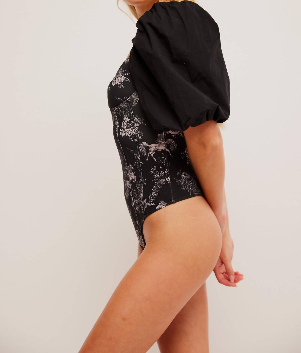 Pair this number with your favorite high-waisted jeans. Step into the season with the Prairie Rose Bodysuit by Free People, a stunning choice for boho chic enthusiasts. This black bodysuit captivates with short puff sleeves and a toile-print bodice for a delicate, feminine vibe. Crafted from an 88% Nylon, 12% Spandex blend, it features a form-fitting, thong bottom design with corset-inspired seams. The bodysuit is completed with a charming low U-back and convenient snap closure, perfect for pairing with a silky slip skirt and ballet flats. Machine wash cold; imported.