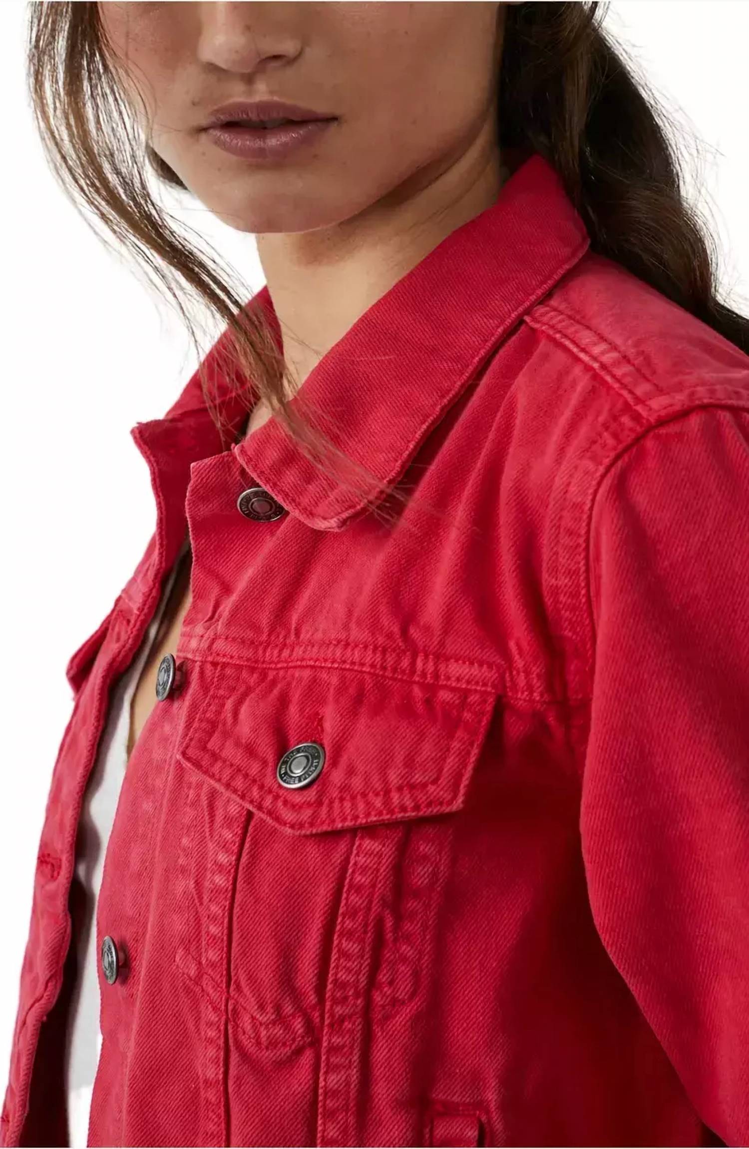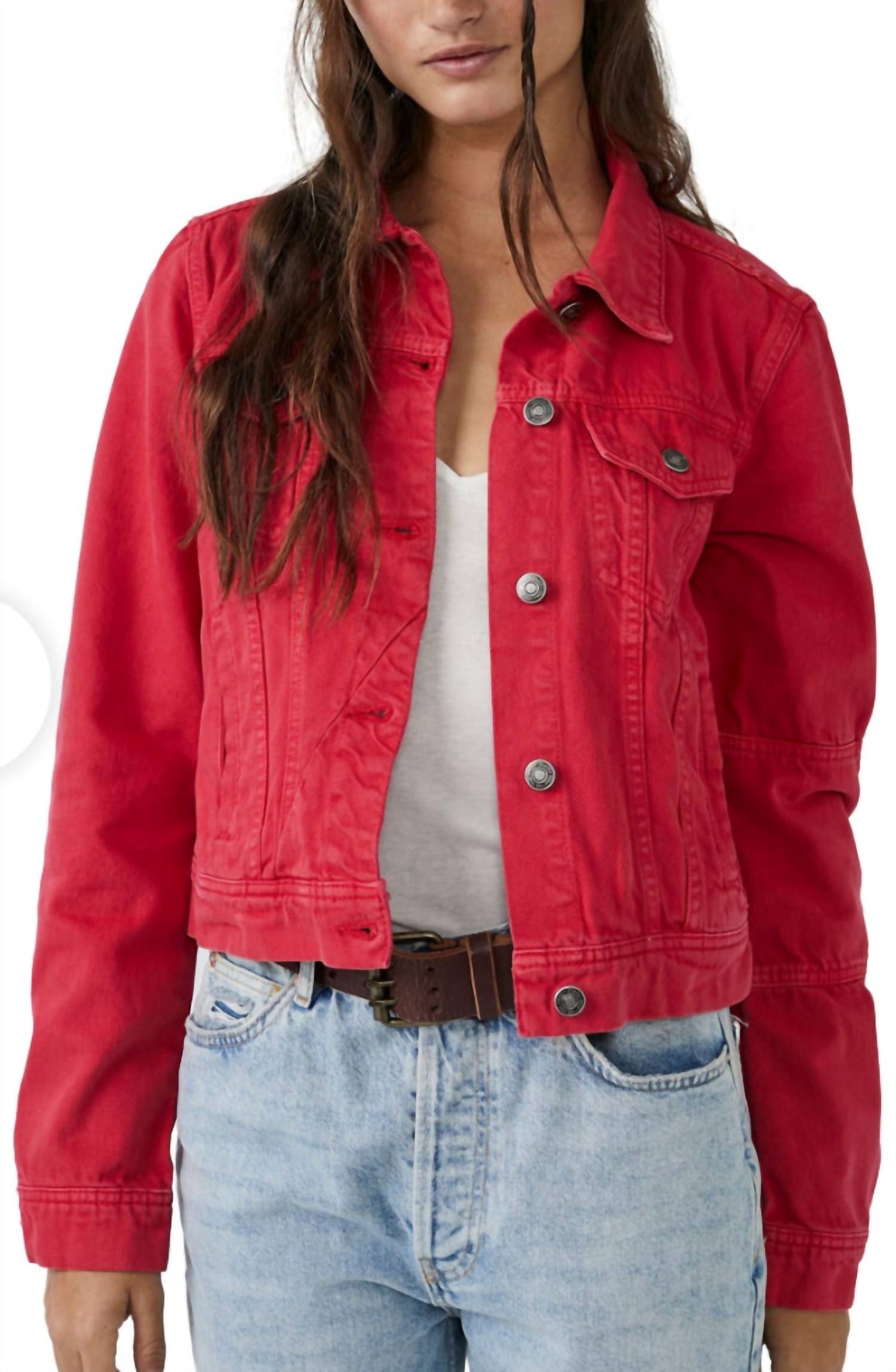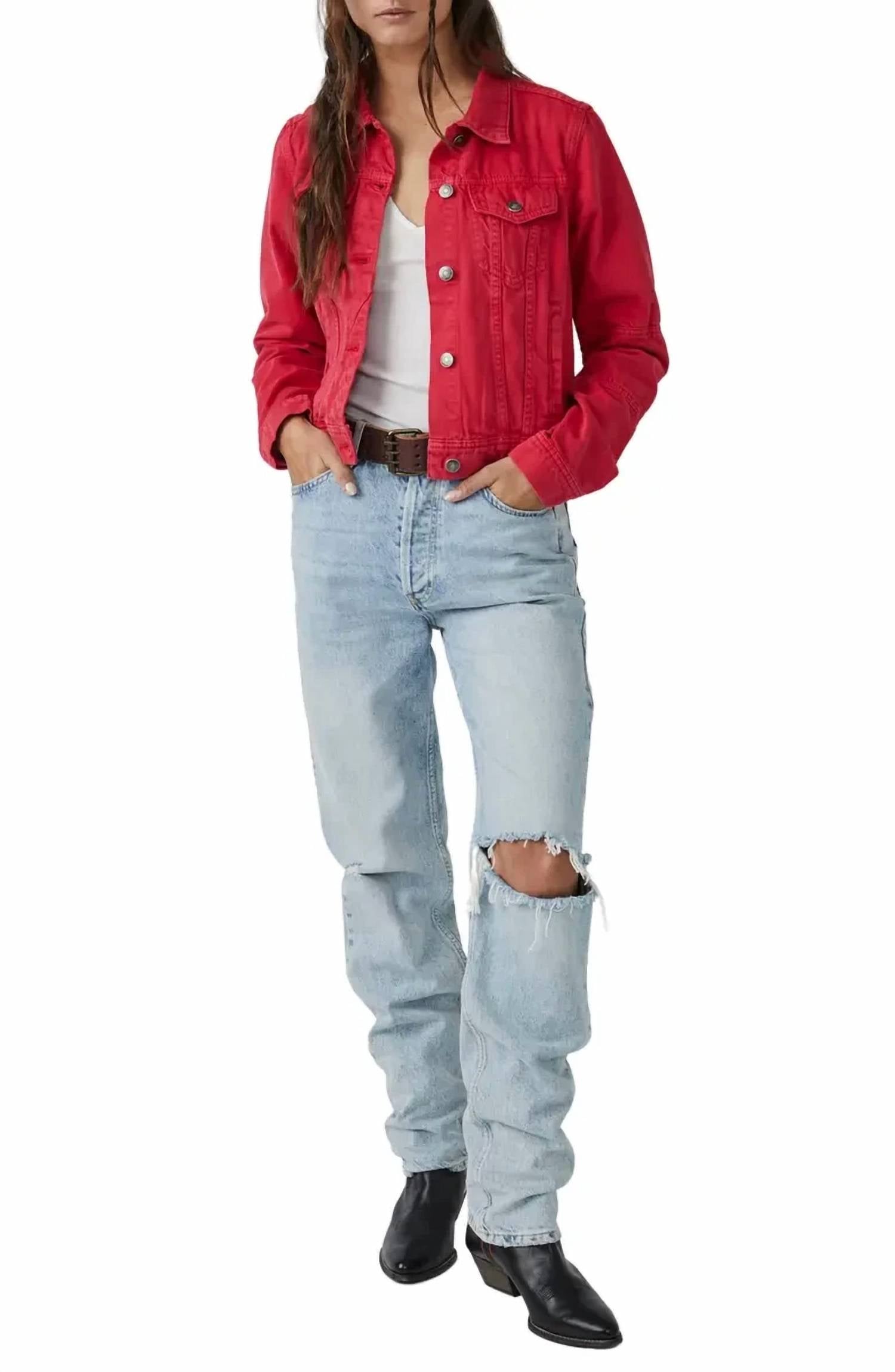 Throw this adorable jacket over just about anything for an effortlessly stylish look. Step out in style with the Free People Rumors Denim Jacket in a striking Strawberry Spritz hue. This women's jean jacket, perfect for spring streetwear or even a Valentine's Day outing, features long sleeves and a spread collar for a classic touch. Made from 100% cotton, it offers a non-stretch denim fabrication with a practical full button front closure and single-button cuffs. Pockets add functionality, making it a great addition to any back-to-school wardrobe. Care is simple with machine wash instructions for easy maintenance.