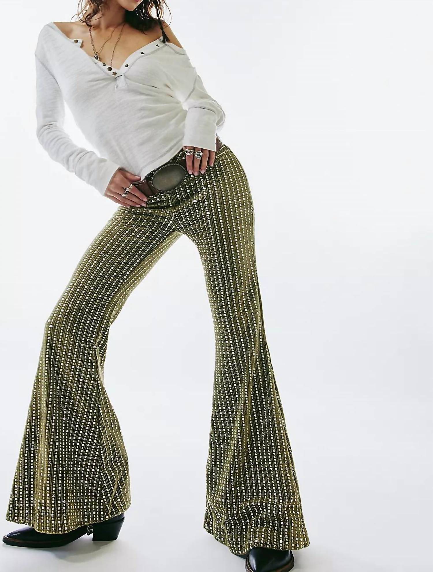 Slightly flared pants are all the rage right now and these are no exception. Pair these with your favorite tee for a more casual look, or with your favorite button-up blouse for an evening out. Get ready to turn heads with the Start Me Up Flare pants by Free People, crafted in a lush Mosstone velvety polyester enhanced with sequins. Designed with a low rise and relaxed flared leg, these statement trousers feature a hidden side zipper closure for a sleek silhouette. Perfect for music festivals or fall festivities, they offer an inseam of 33 inches with a rise of 10 inches, making them ideal for a bold, vintage-inspired look. Care for these striking flares by hand washing them to ensure long-lasting shine and style.