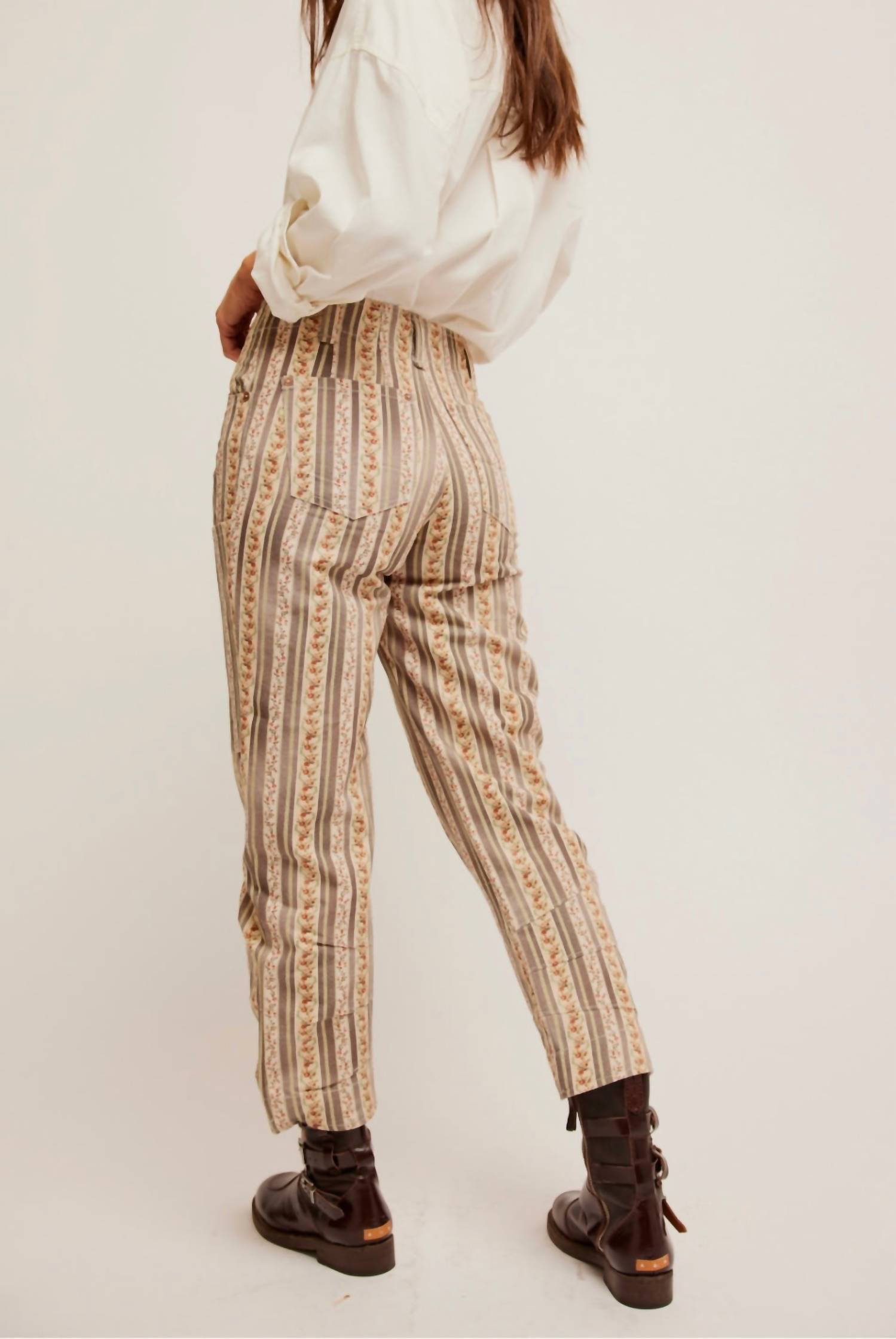 A straightleg pant that workes season after season. Dress these up with your favorite blouse or keep it casual with your go-to tee. Discover the Super Sonic Printed Slim Pants by Free People, an effortlessly stylish choice in a Neutral Combo stripe pattern. Expertly crafted from 100% cotton, these pants offer a low-rise, slim fit with a straight leg. Featuring a utility pocket detail, and tucked pleating, they are secured with a front button and zipper closure. Machine wash and lay flat to dry. Approximate measurements include a 35" length, a 26" inseam, a 15" waist, and a 9" rise.