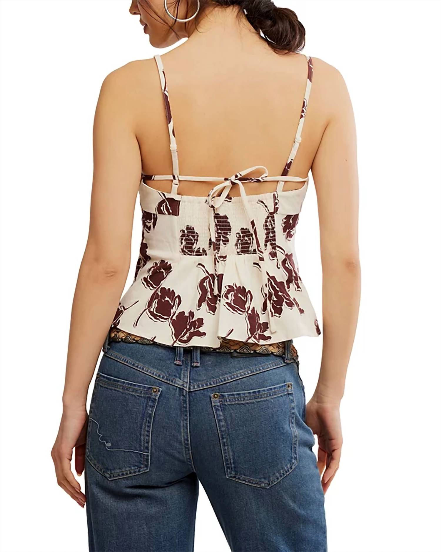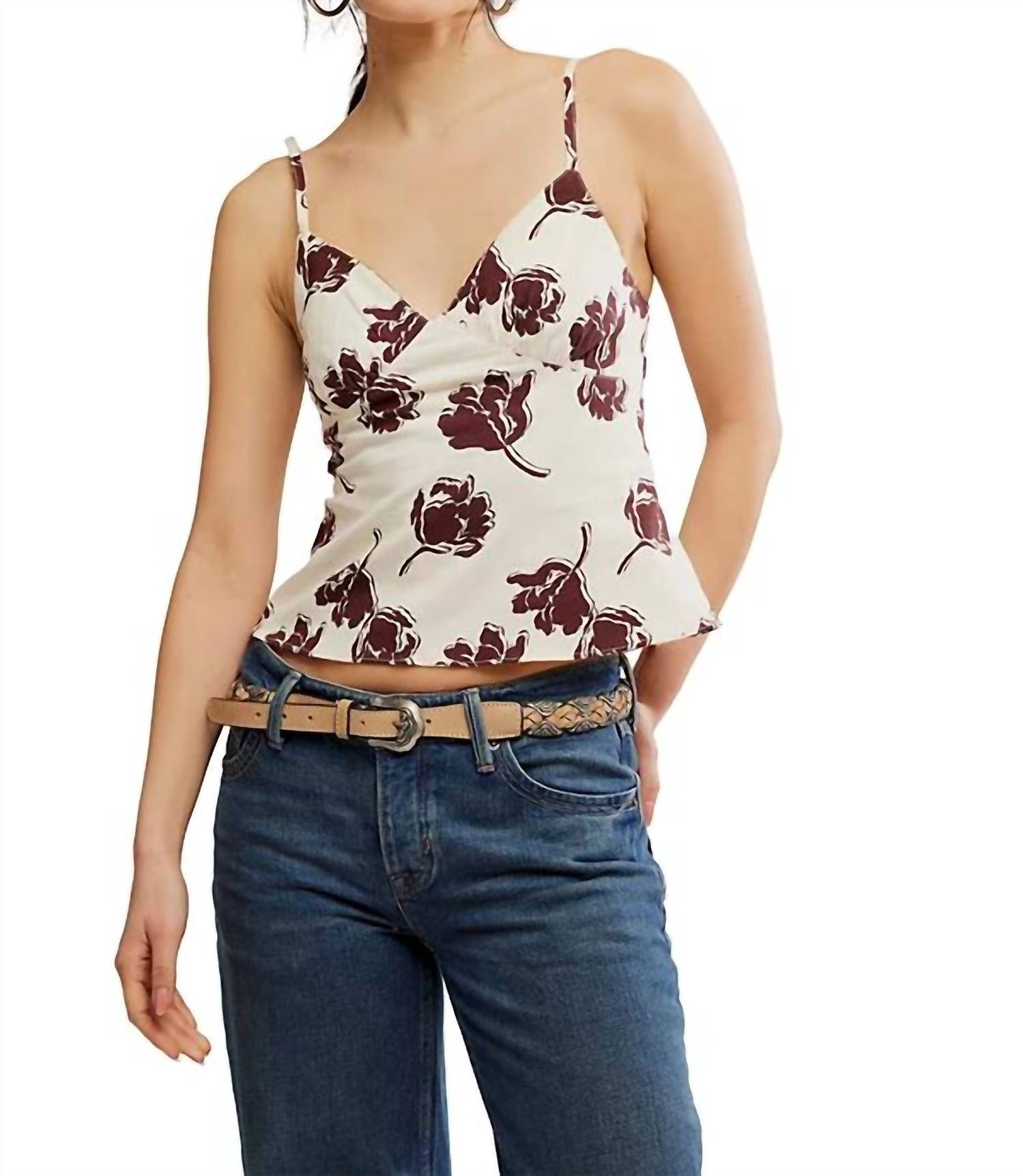 Fit, fabric and functionality. This tank top checks all the boxes. Introducing the Susie Printed Top by Free People, perfect for a vacation-ready look in Bittersweet Combo. This women's tank top features delicate spaghetti straps and a flattering V-neckline, crafted from a slightly stretchy cotton blend with floral patterns. The fitted, semi-cropped cami includes ruched triangle cups and a smocked back, with a tie closure ensuring a perfect fit. Composition: 59% Cotton, 22% Linen, 17% Rayon, 12% Elastane. Care for it easily with machine wash instructions.