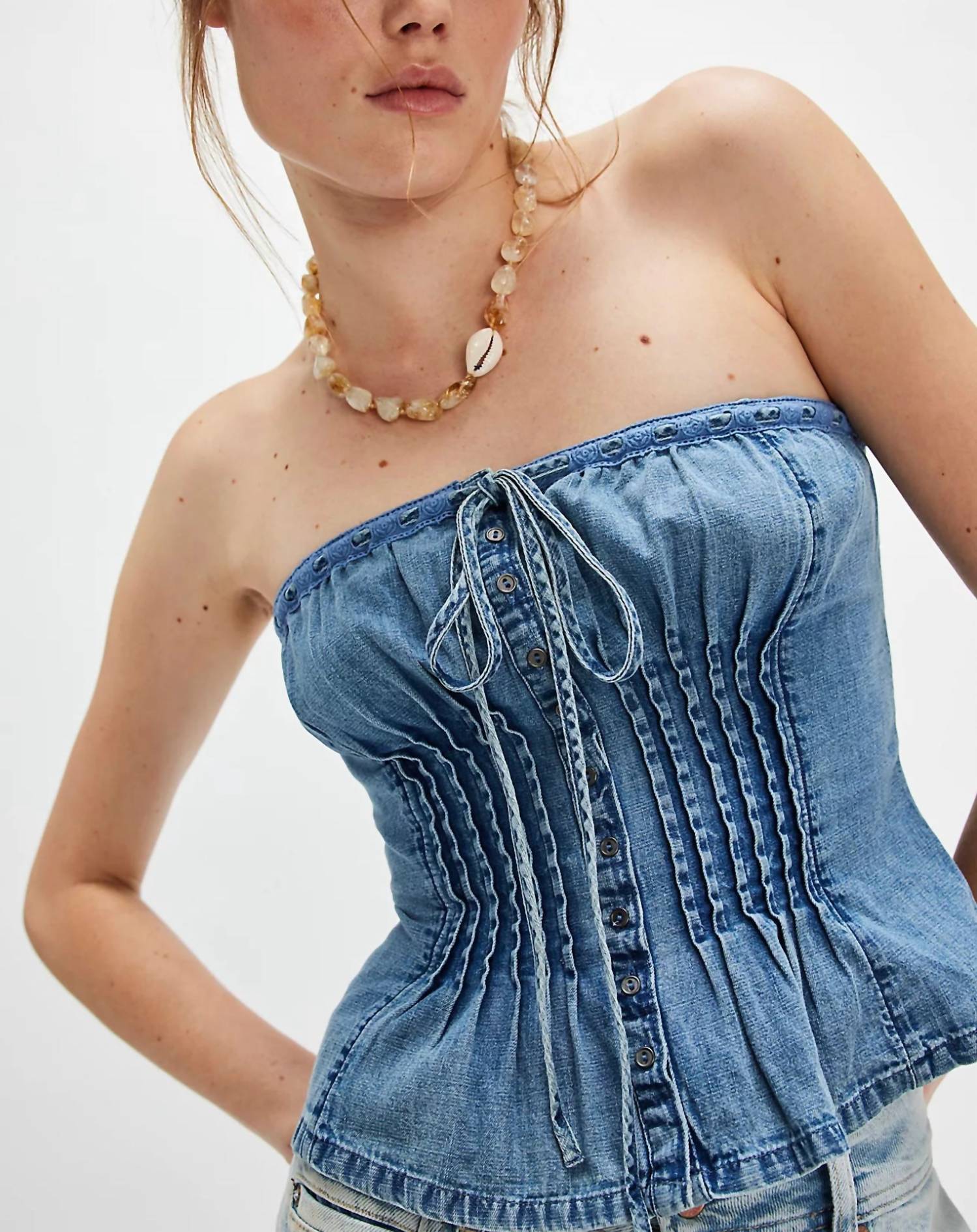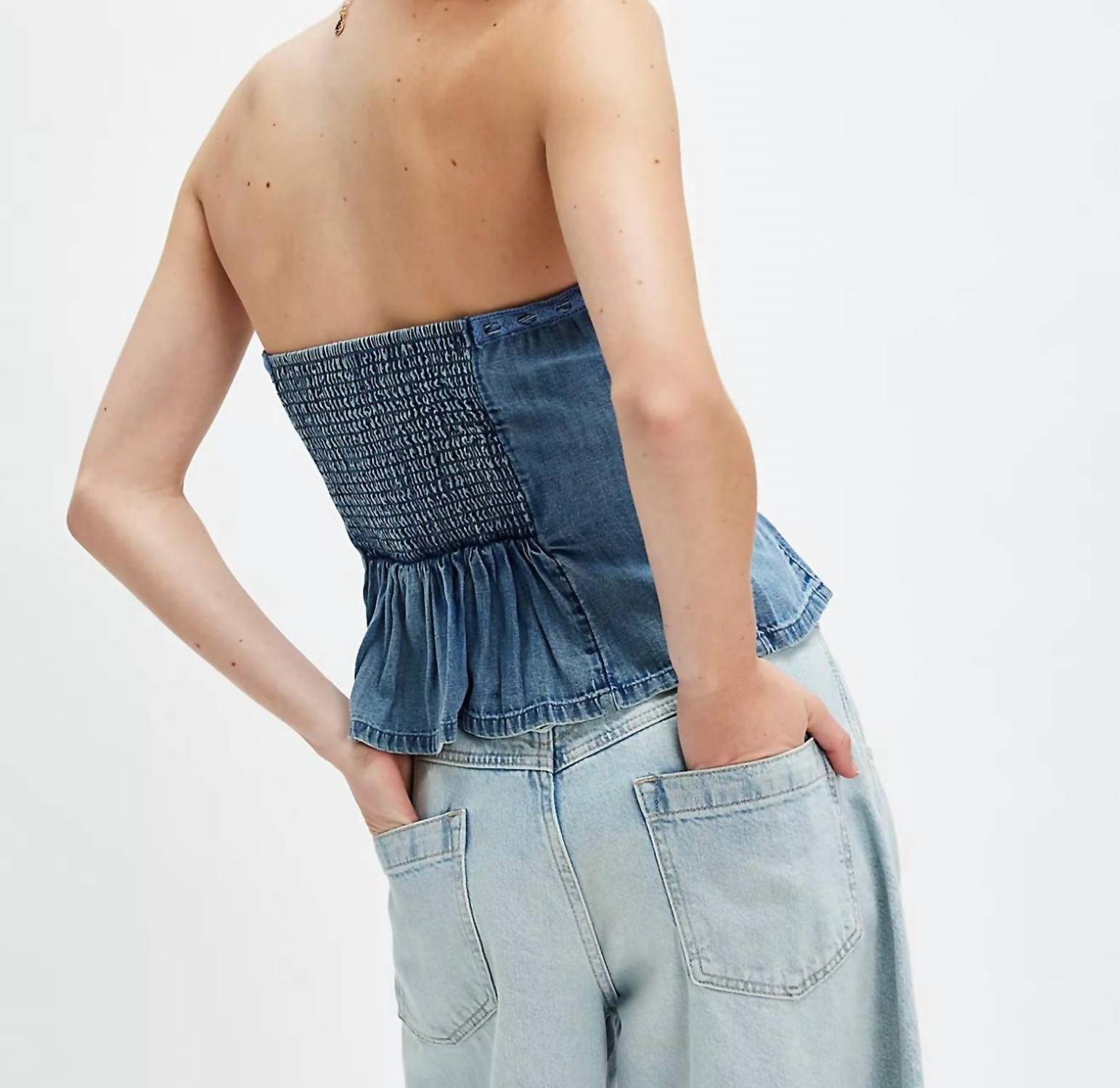 A versatile blouse that works from desk to dinner! Meet the Free People Wink Wink Denim Tube, a captivating strapless top that redefines summer style. Expertly crafted with washed denim, this semi-cropped blouse showcases pintucked details, a button-front closure, and a tie detail with slotted accents. Its standout feature is a flared peplum hem with a smocked backing that adds a playful touch. This piece is machine washable and can be tumble dried, offering easy care for effortless wear.