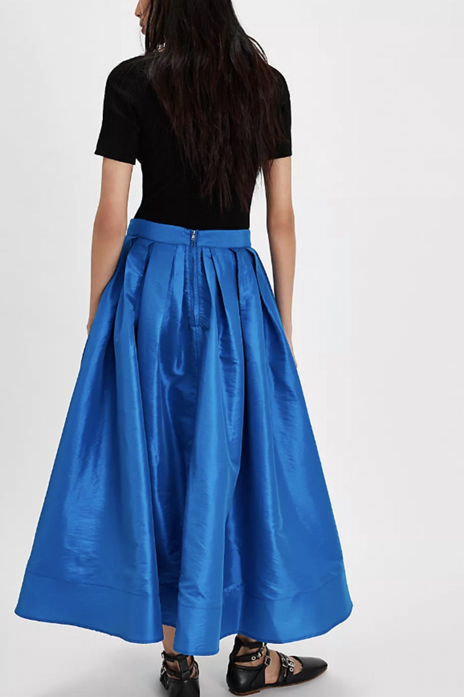 Dress this pencil skirt up with a blazer or down with your favorite tee. So versatile and timeless. The Free People Women's Emilia Full Skirt in blue is a standout piece for any vacation wardrobe. This high-rise skirt features a full A-line silhouette with a sheen finish and pleating at the top, creating an elegant look. Made from poplin fabrication, it includes an invisible zip closure for a smooth finish and even offers pockets for added functionality. Perfect for Summer, this skirt is ideal for Boho Chic trends and can be styled up or down with ease.