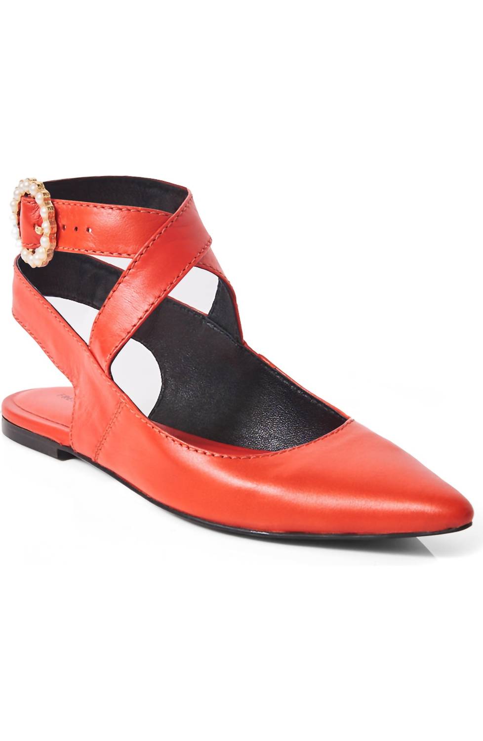 A classic loafer that is both comfortable and polished. Discover timeless elegance with Free People's Women's Parisa Point Flat in eye-catching red. These flats showcase sophisticated leather uppers with a sharp pointed toe, wrapped ankle strap, and a pearl-adorned adjustable buckle for a touch of grace. Made from premium leather and rubber, they feature slip-on styling with a flat heel under 1 inch for chic comfort.