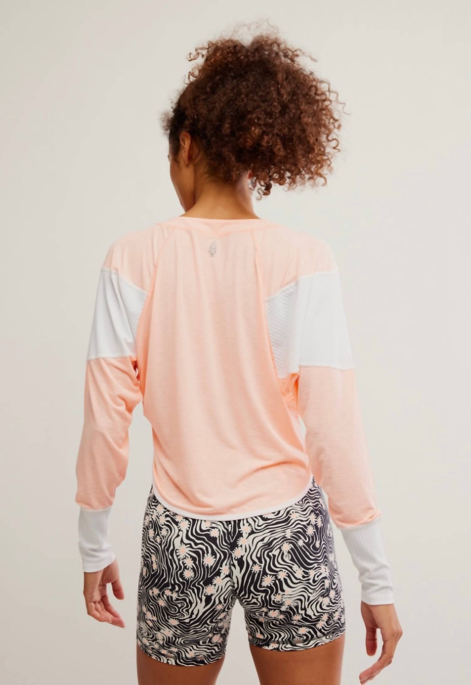 The perfect long sleeve tee that goes with just about anything. Elevate your workout wardrobe with the Women's Spotlight Long Sleeve by Free People, offered in a pastel peach combo for a touch of color. Crafted with a relaxed, slouchy fit, this athleisure piece features long raglan sleeves with slightly exaggerated design and a boatneck neckline. The pull-on closure and contrast ribbed piecing with a rounded bottom hem ensure an effortless, stylish finish perfect for fitness and workout sessions. Care: Machine wash cold.