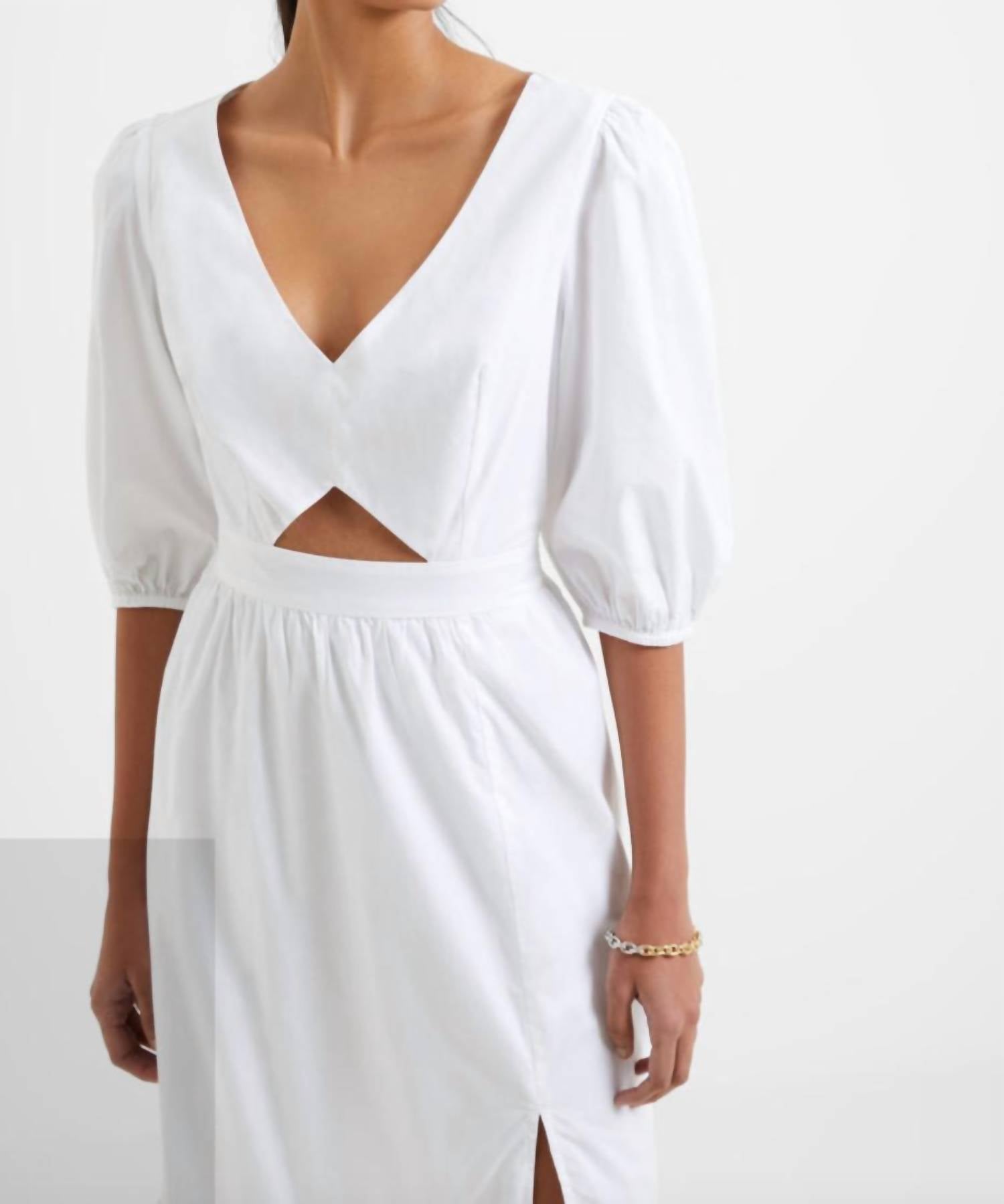 Just add slides or mules and you are good to go.Midi dress. Fabric: conscious, poplin, lightweight. V-neckline. Cut out detailing. Front slit. Back zip closure. Model is 5ft10" and wearing a Size S.