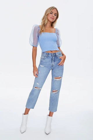 GUESS Women's Smocked Puff Sleeve Top Blue Size Medium