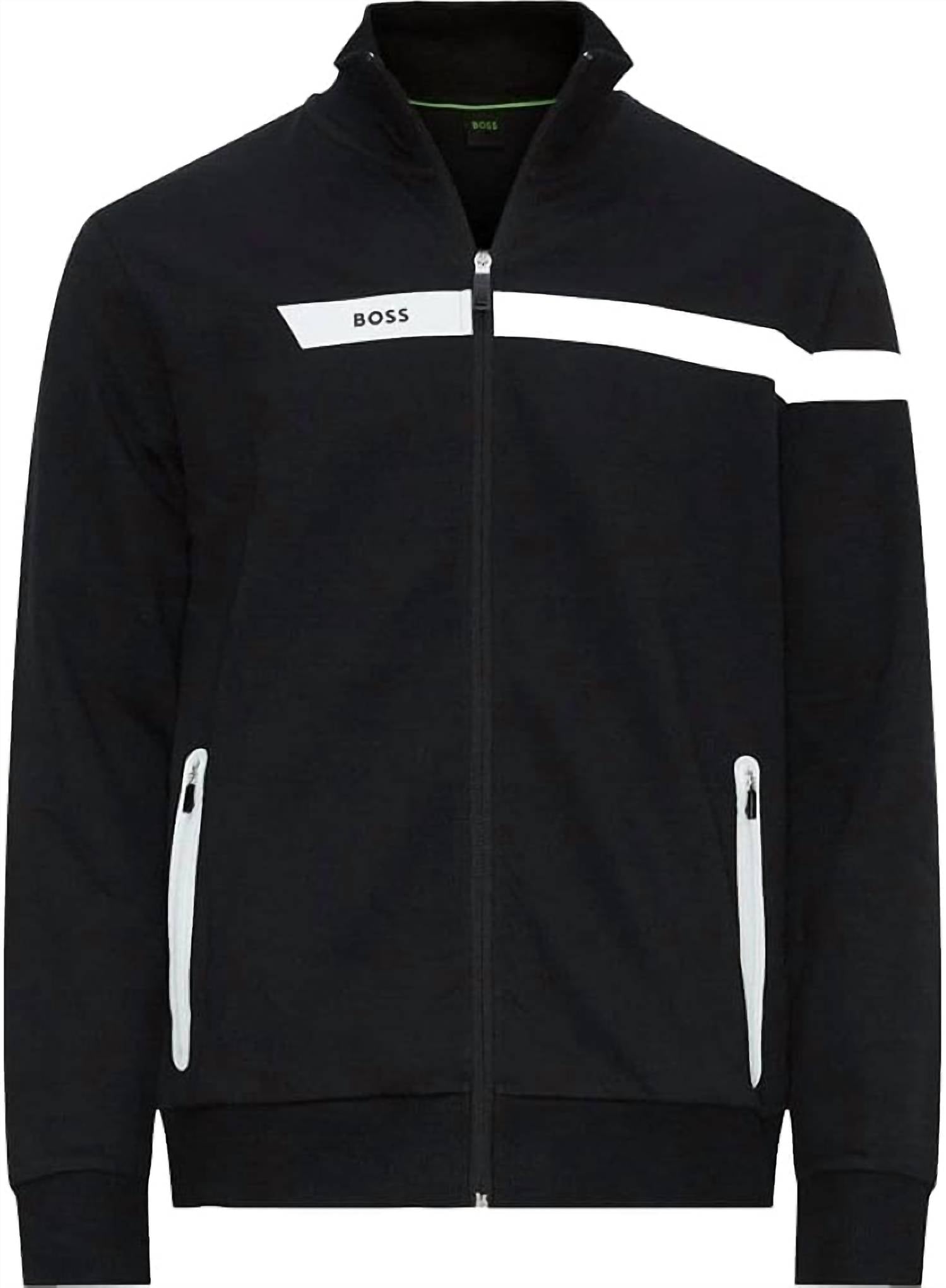 Discover the Skaz Sweatshirt by Hugo Boss, crafted with long sleeves and 100% cotton for ultimate comfort and style. This solid black men's sweatshirt features a mockneck design, complemented by a full zip closure and white trim for added sophistication. Originating from an imported collection, it includes functional pockets for convenience. For care, simply machine wash and lay flat to dry to maintain its pristine condition.