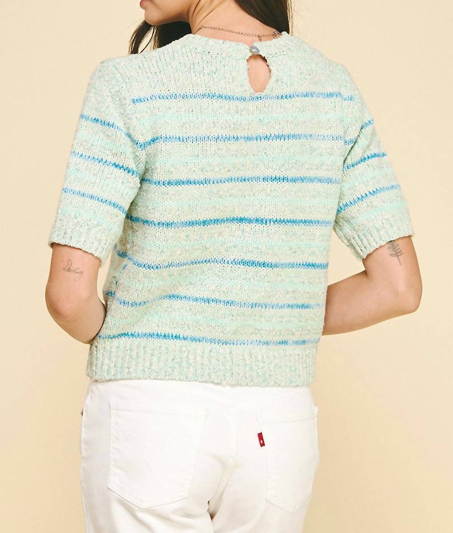 Discover the Pippa Multi Knit Sweater by PINCH, a stylish choice for women who love vibrant colors. This short sleeve sweater, perfect for fall dinner parties, features a youthful striped pattern in turquoise, pastel jade, and ivory, complemented by a classic crewneck. Crafted from a mid-weight cotton blend, it boasts a composition of 60% cotton, 20% polyester, 10% polyamide, and 10% acrylic. Closure: Button closure. Care: Dry clean only. Available sizes offer a bust measurement of 36" for small, 38" for medium, and 40" for large, with lengths of 20.5", 21.5", and 22.5" respectively.