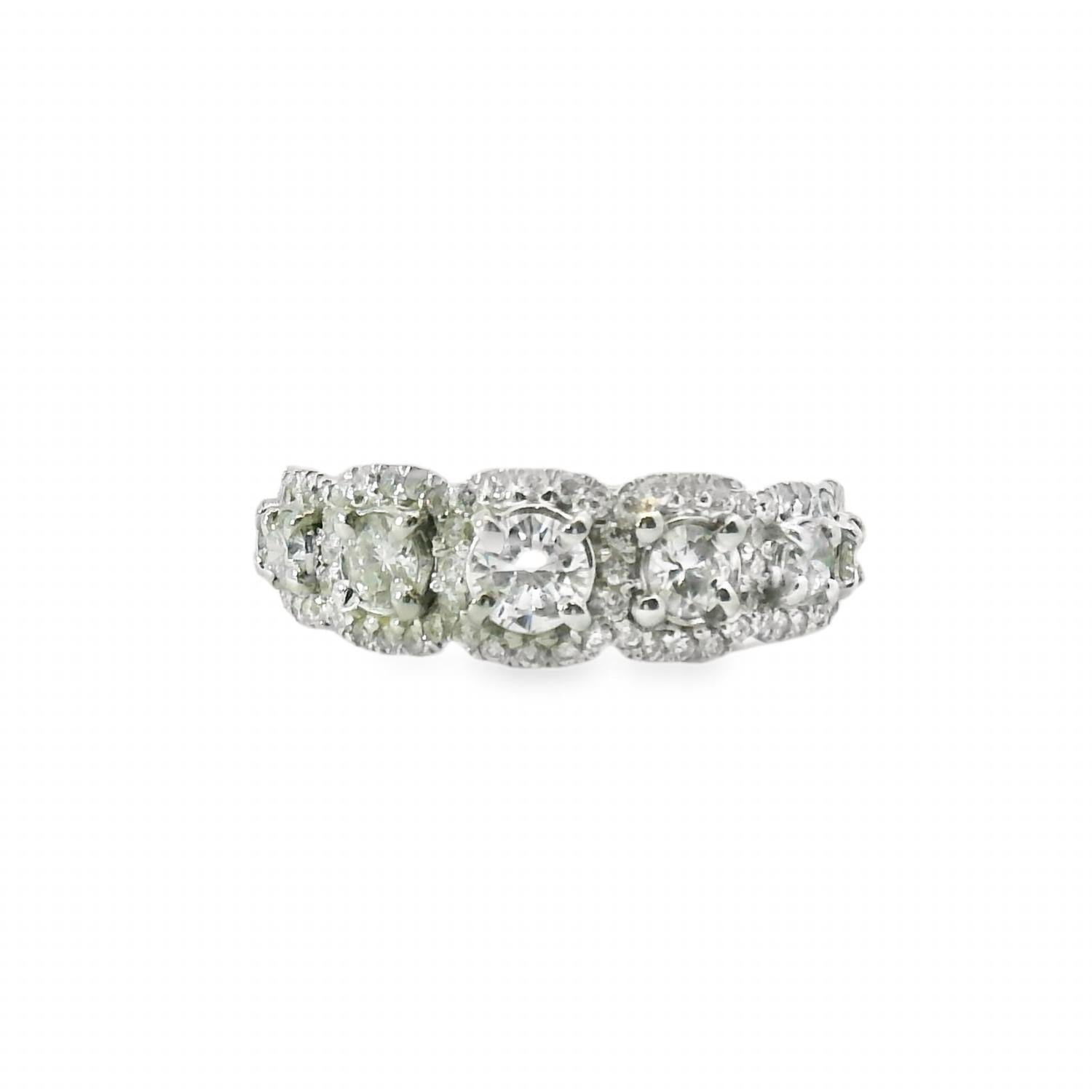 Wear this ring stacked or by itself... you can't go wrong. Elevate your special occasion with the Women's Seven Diamond Halo Wedding Ring by Normani. Crafted from 14-karat white gold, this exquisite piece features 7 round diamonds, totaling 1.15 carats, each elegantly encased in its own halo, totaling 0.60 carats, and finished with a push back clasp. Delight in the premium D-F color grade of these round brilliant gems. While crafted with precision, this refined ring can also be sized for the perfect fit.