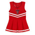 Root for your team with the Girl's Cheer Bodysuit Dress by Creative Knitwear, crafted in the spirited Texas Tech Red. This high-quality dress is composed of 100% premium cotton, ensuring comfort and freedom of movement for your little cheerleader to dance and cheer. It features convenient 2 snap closures on the backside and additional snap closures beneath the pleated skirt for quick outfit changes. Perfect for game days, this officially licensed dress boasts team embroidery for that extra touch of collegiate pride.