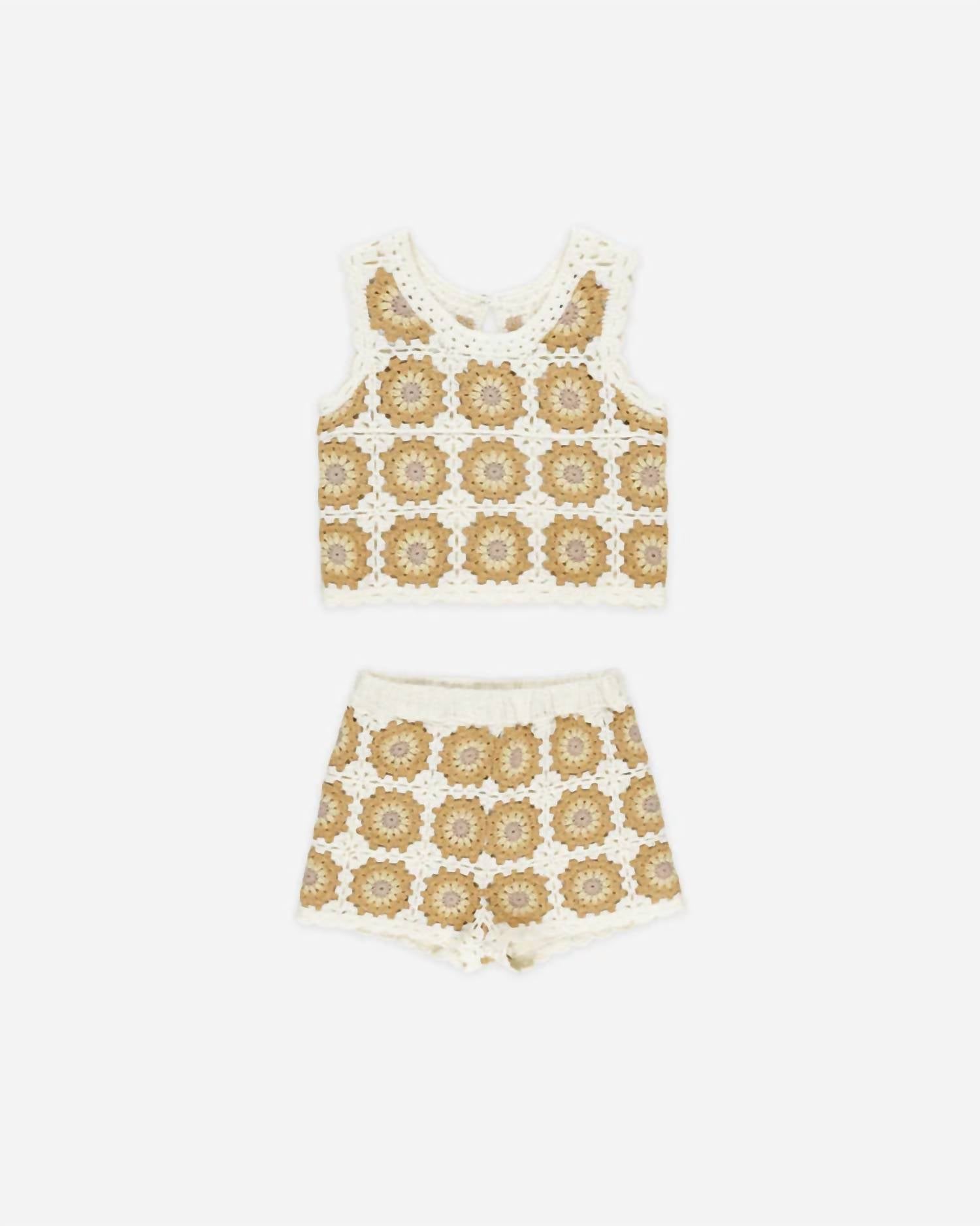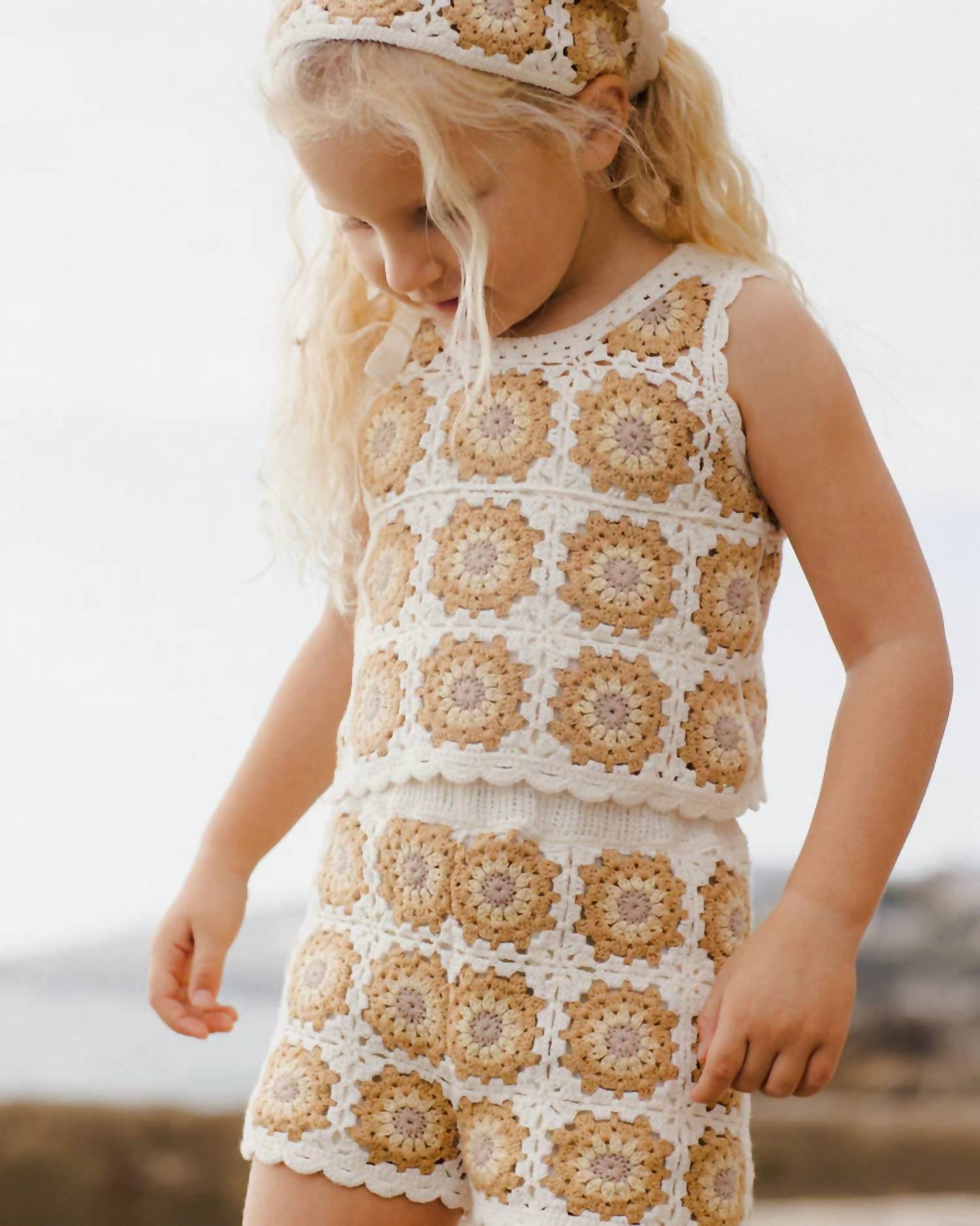 Introduce your little one's wardrobe to the Girls Crochet Set by Rylee & Cru, a delightful addition in a bold marigold hue. This tank set, featuring a charming 'marigold daisy' pattern, is crafted entirely from 100% cotton, ensuring both comfort and style. Care for it by hand washing and laying it flat to dry, maintaining its soft texture and vibrant color. Ideal for creating playful summer looks, this set captures a groovy retro vibe perfect for sunny adventures.