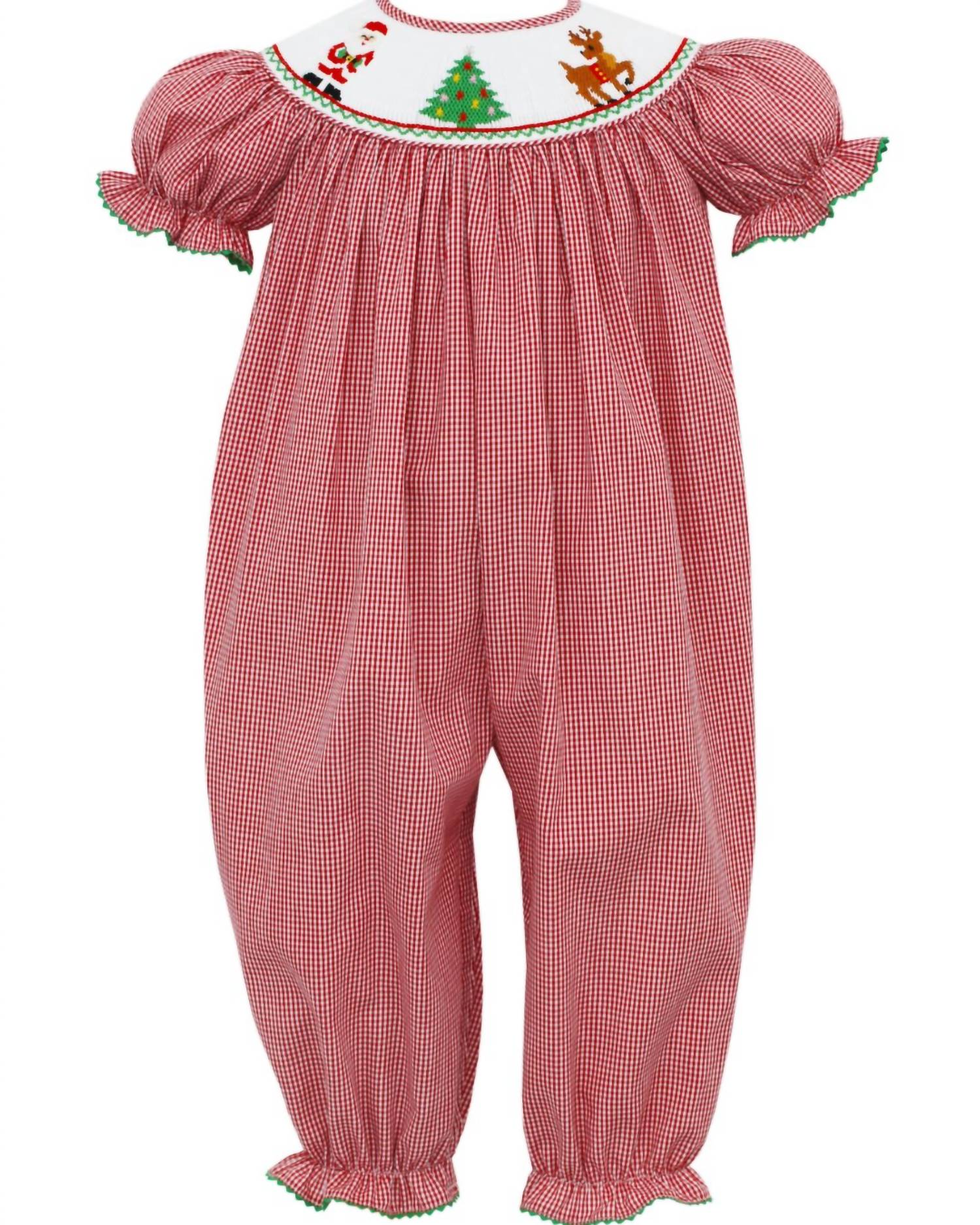 The Kids Smocked Santa Claus Romper by Anavini is a delightful choice for holiday festivities. Featuring an adorable red gingham pattern, this romper is perfect for girls and ideal for winter Christmas celebrations. Crafted with care for holiday parties, this piece brings festive cheer with its charming Santa Claus smocking detail.