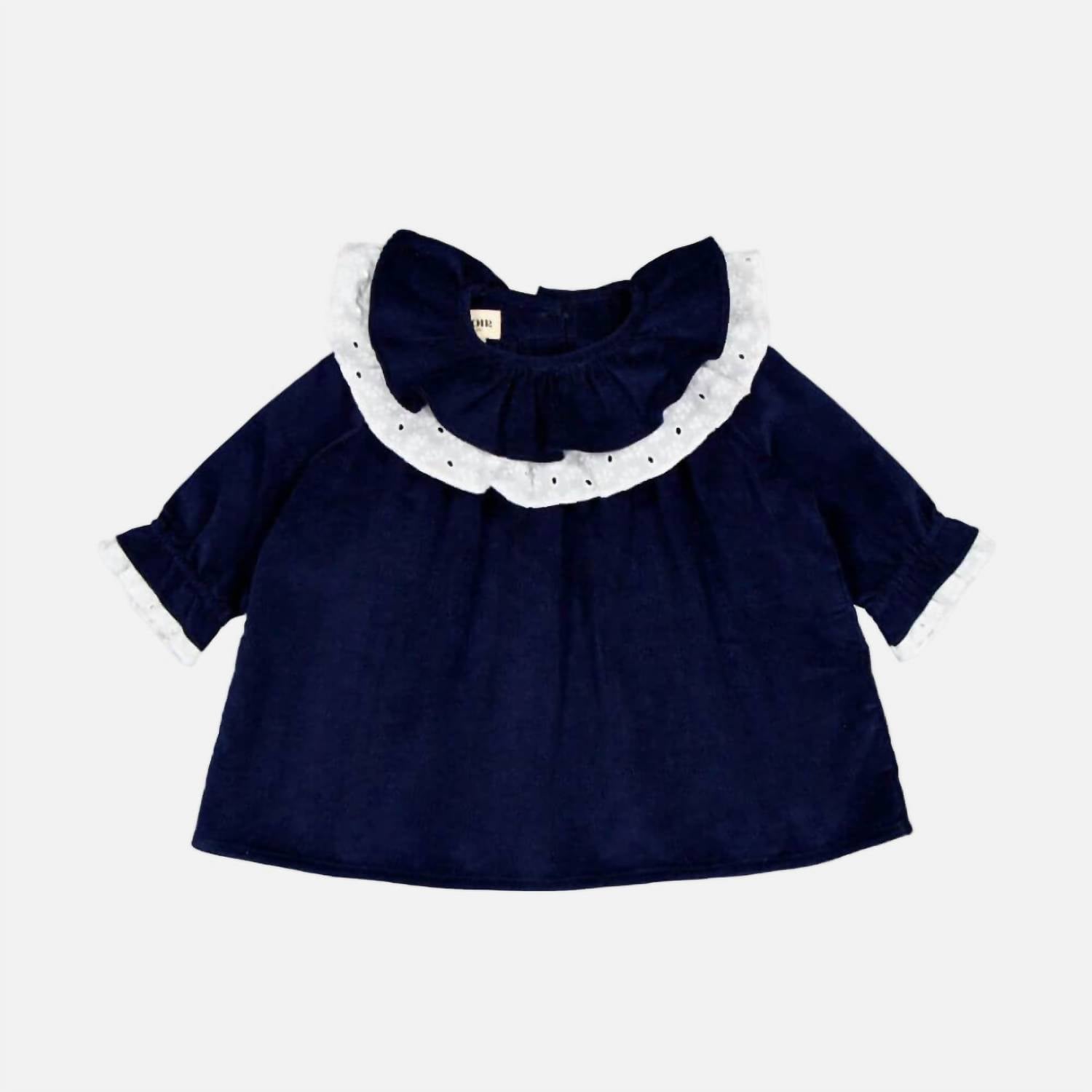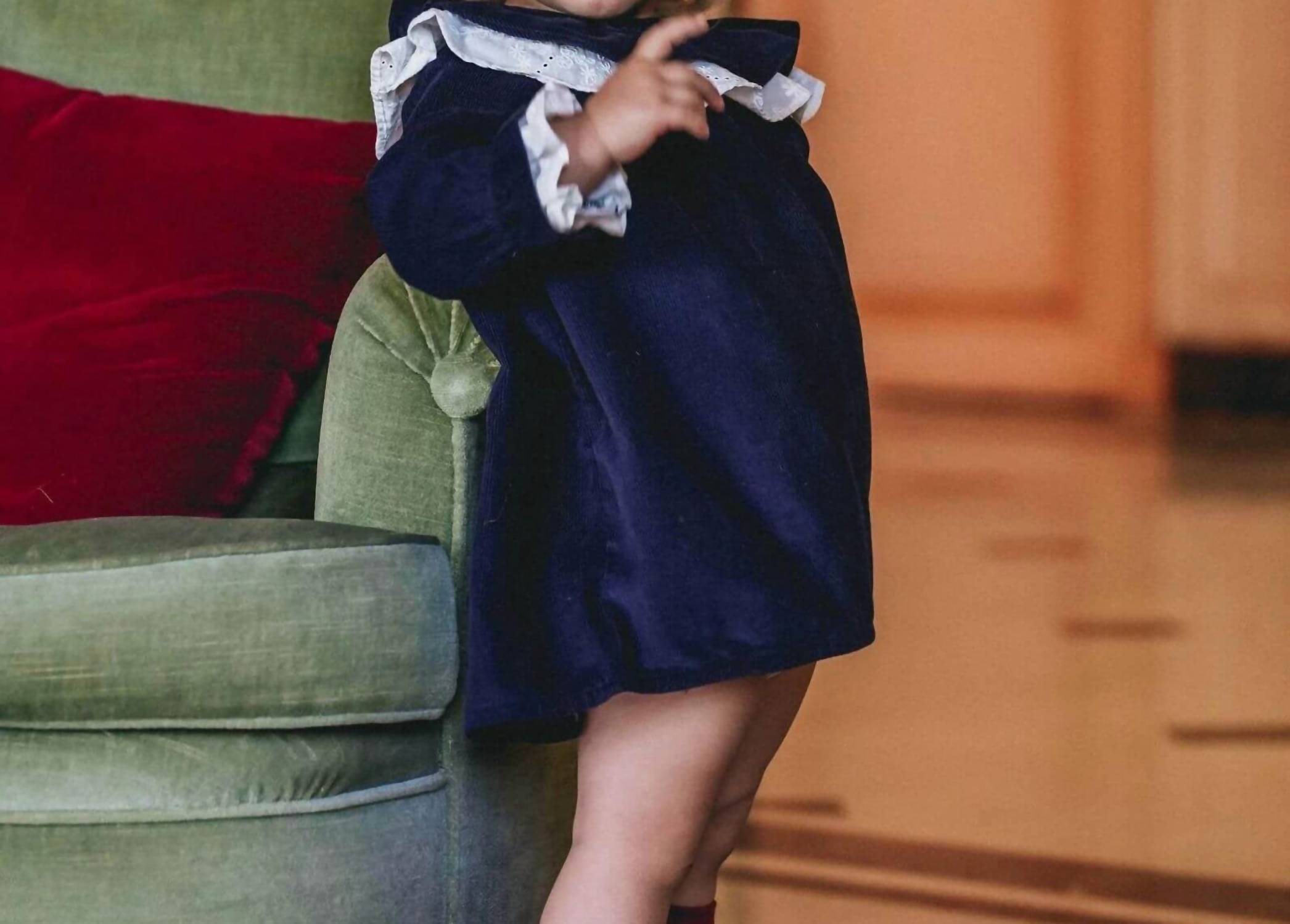The Kid's Corduroy Dress by Loir Paris in Navy Blue is an adorable addition to any little girl's wardrobe. Featuring short sleeves and crafted from a soft, solid navy corduroy, this shift dress offers a preppy look perfect for fall and Thanksgiving festivities. Designed with a scoopneck silhouette, this casual piece reflects impeccable Parisian craftsmanship. Easy to care for, simply machine wash and tumble dry as needed.