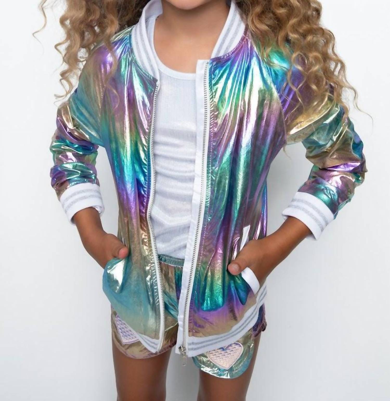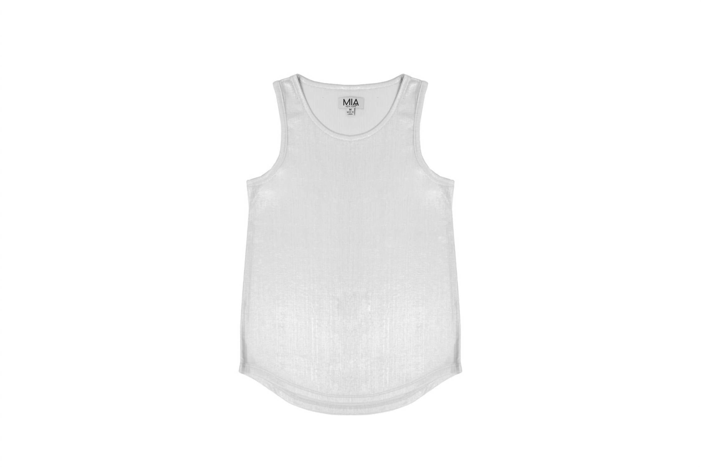 Embrace the futuristic vibe with the MIA Girl's Holographic Tank Top, perfect for your little one's spring adventures. This sleeveless tank features a shiny holographic hue over a silver body, complete with a banded scoop neckline and a curved bottom hem. Composition: 95% Polyester, 5% Spandex. Its lightweight, pull-on design makes it an ideal choice for athleisure or vacation wear.