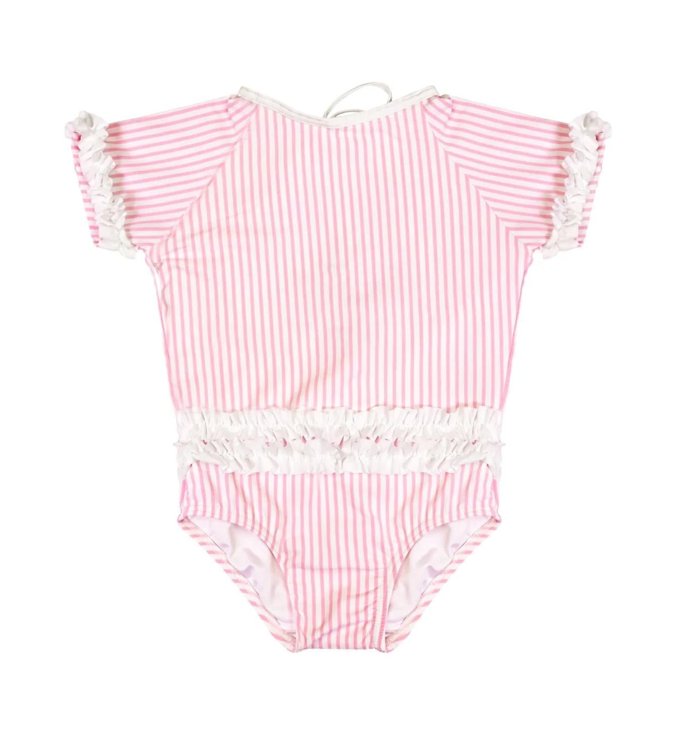 The Planet Sea Girl's Stripes Swimsuit in vibrant pink is a stylish one-piece designed for a classic beach day. This tankini swim top features a fun stripe pattern, offering nostalgic 90s fashion flair that's perfect for any summer occasion. Each swimsuit by Planet Sea is crafted with the utmost care, focusing on protection and style. Made with UPF50+ UV protection, this swimsuit ensures your child enjoys beach or pool days with added sun safety.