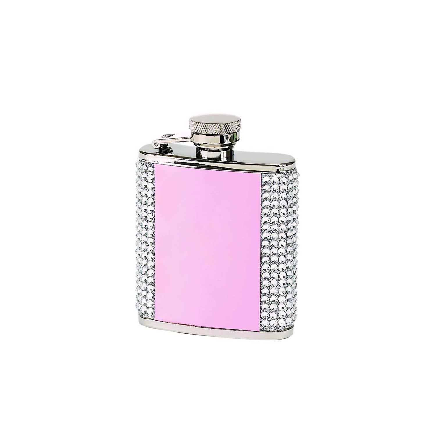 2.5" Width x 3.5" Height. Capacity: 2.5 oz. Material: Adorned with sparkling crystals and a pink plated front and back. Design: Compact and portable with a securely hinged cap. Comes beautifully packaged in a gift box.