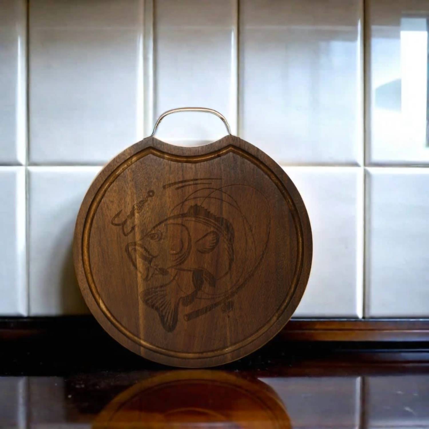 13" Diameter. Material: High-quality dark wood. Design: Features detailed bass, fishing rod, and hook imagery. Care Instructions: Hand wash recommended in warm, soapy water to maintain its finish.