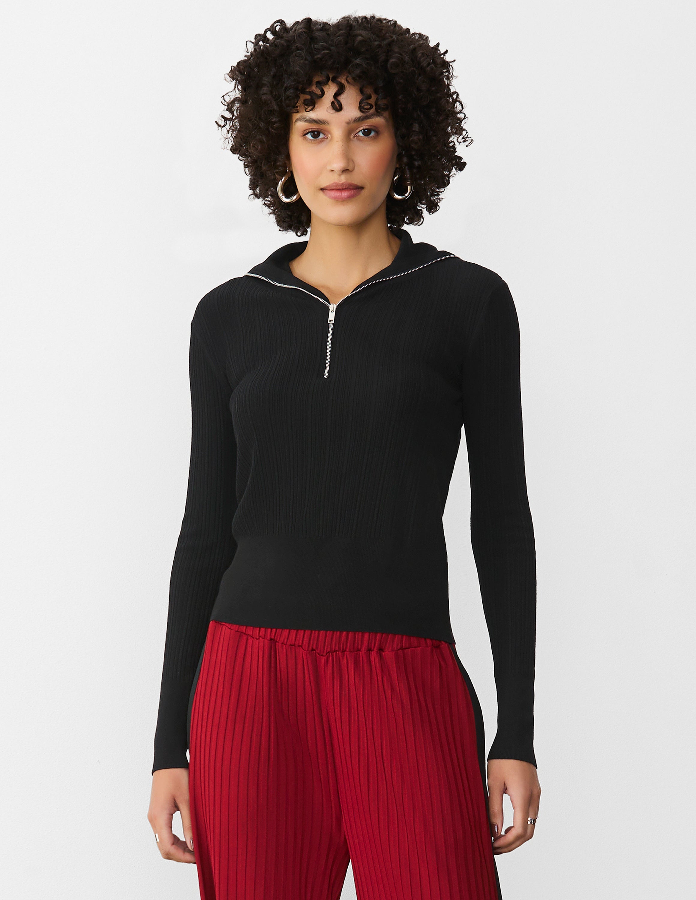 The Open Collar Zip Sweater: made of a soft fine gauge rib for a touch of refined luxury.