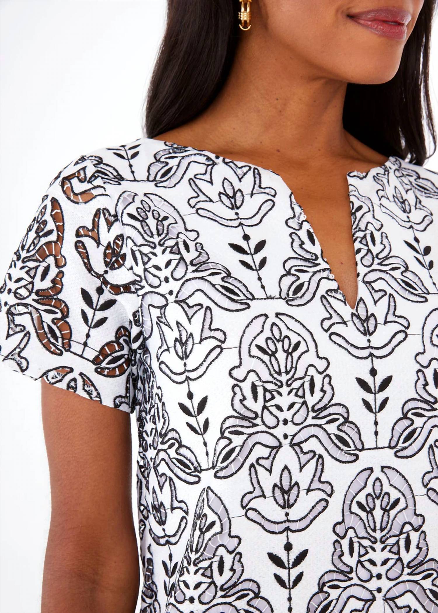 The kind of easy and flattering dress you'll be reaching for all season long. Make a stylish entrance at your next event in this eye-catching yellow and blush brocade shift dress. Complete with inseam pockets, a flattering v-neckline, and a short sleeve, this dress is a go-to if you're looking for something dressy and comfortable. The mod 60's inspired look pairs perfectly a nude heel or a neutral boot for a modern twist. Generous fit. We recommend sizing down if you are in between sizes. Length from shoulder to hem: 34 1/2" (approximately size small) Sleeve length: 5" (approximately) Back zipper closure Fully lined Inseam pockets Fabric: Metallic Jacquard Dry clean recommended