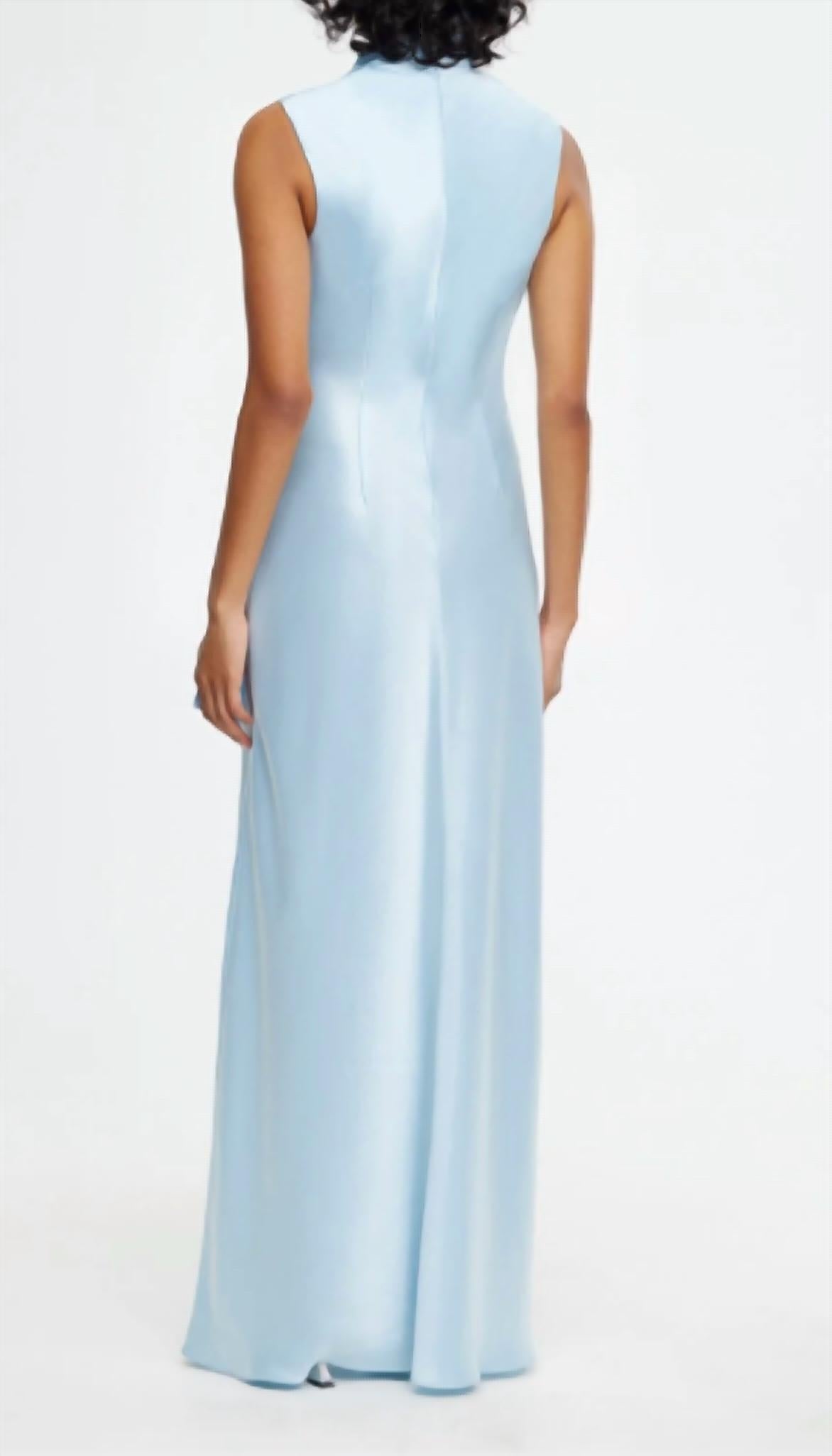 A maxi dress that is just as cute as it is comfortable. Elevate your wardrobe with the Acler Jeffries Maxi Dress in Light Cornflower, a stunning piece designed for the modern woman. This sleeveless satin dress in a fit and flare silhouette offers elegance and sophistication. Featuring a pleated neck drape and a center back invisible zip closure, it beautifully enhances your figure while ensuring ease of movement. Crafted without lining, this dress embodies a lightweight and graceful appeal, perfect for any occasion.