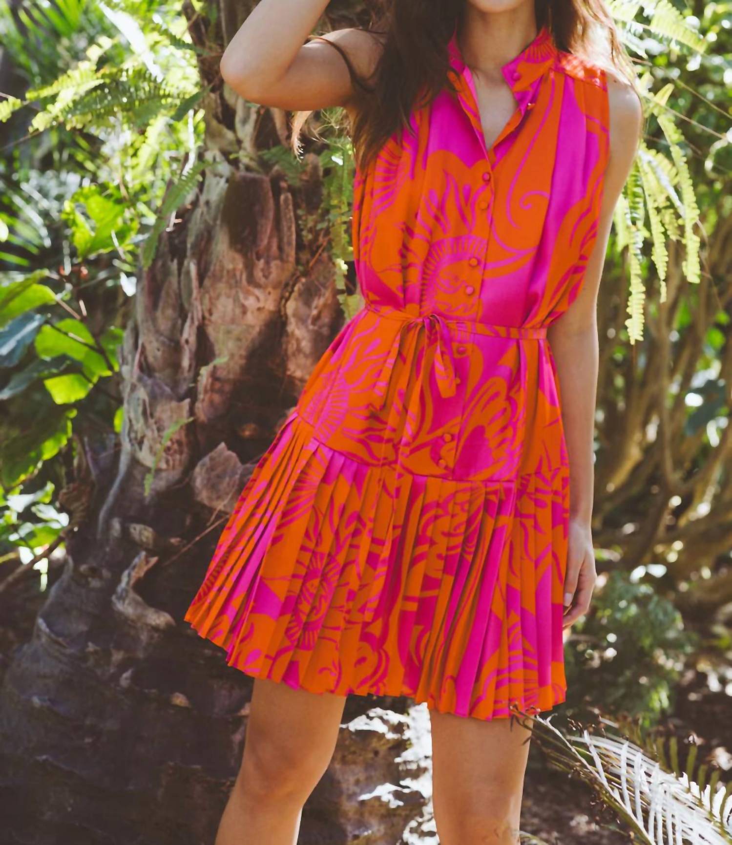Elevate your repertoire with the Bella Dress by Alden Adair, perfect for transitioning from day to night in its vibrant Bloom color. This sleeveless mini dress flaunts a patterned design crafted from 100% Polyester, featuring a charming tiered drop waist skirt and a matching belt. Made from Poly Charmeuse, it offers both style and comfort with its button closure. Care instructions are conveniently machine wash cold and tumble dry low.
