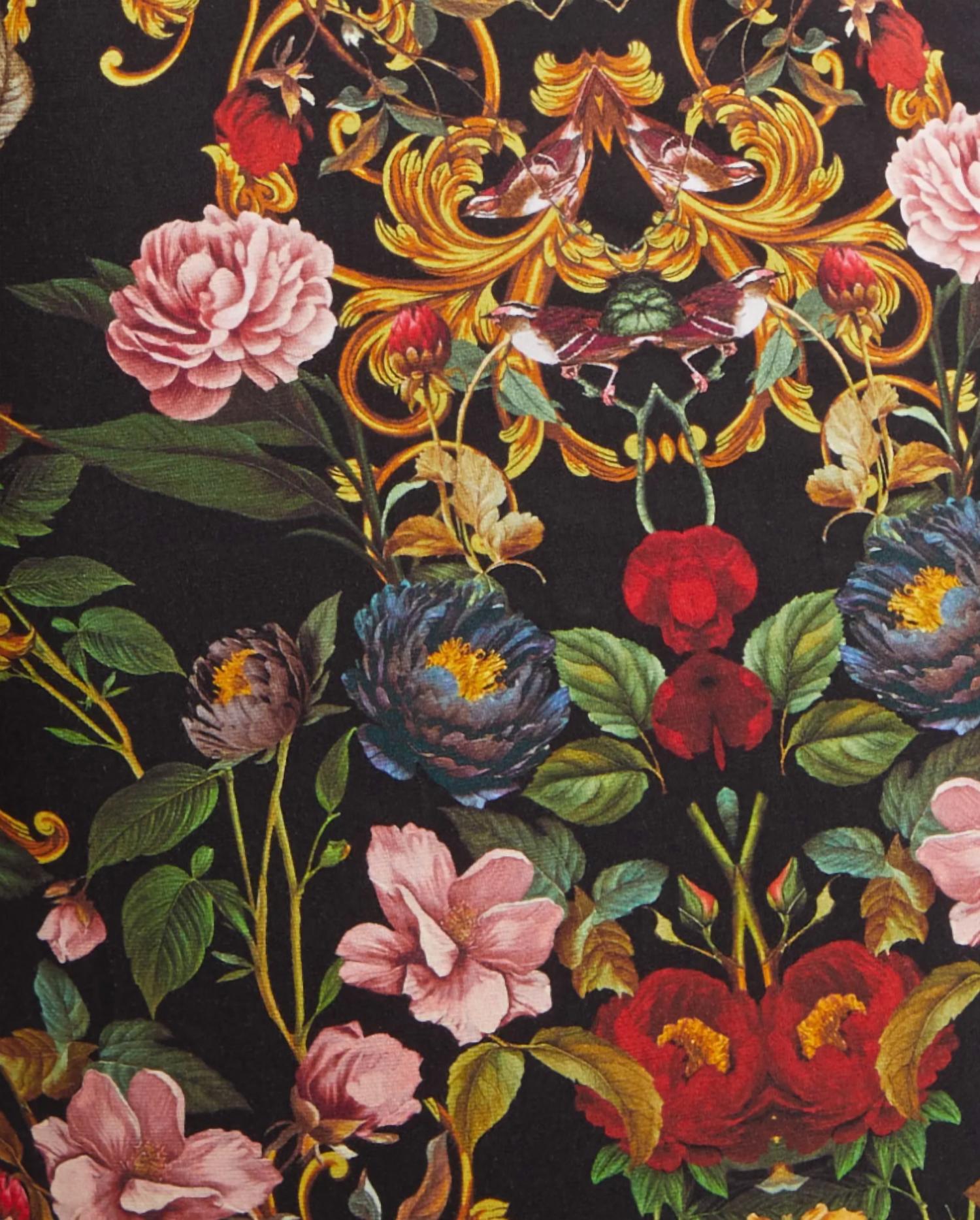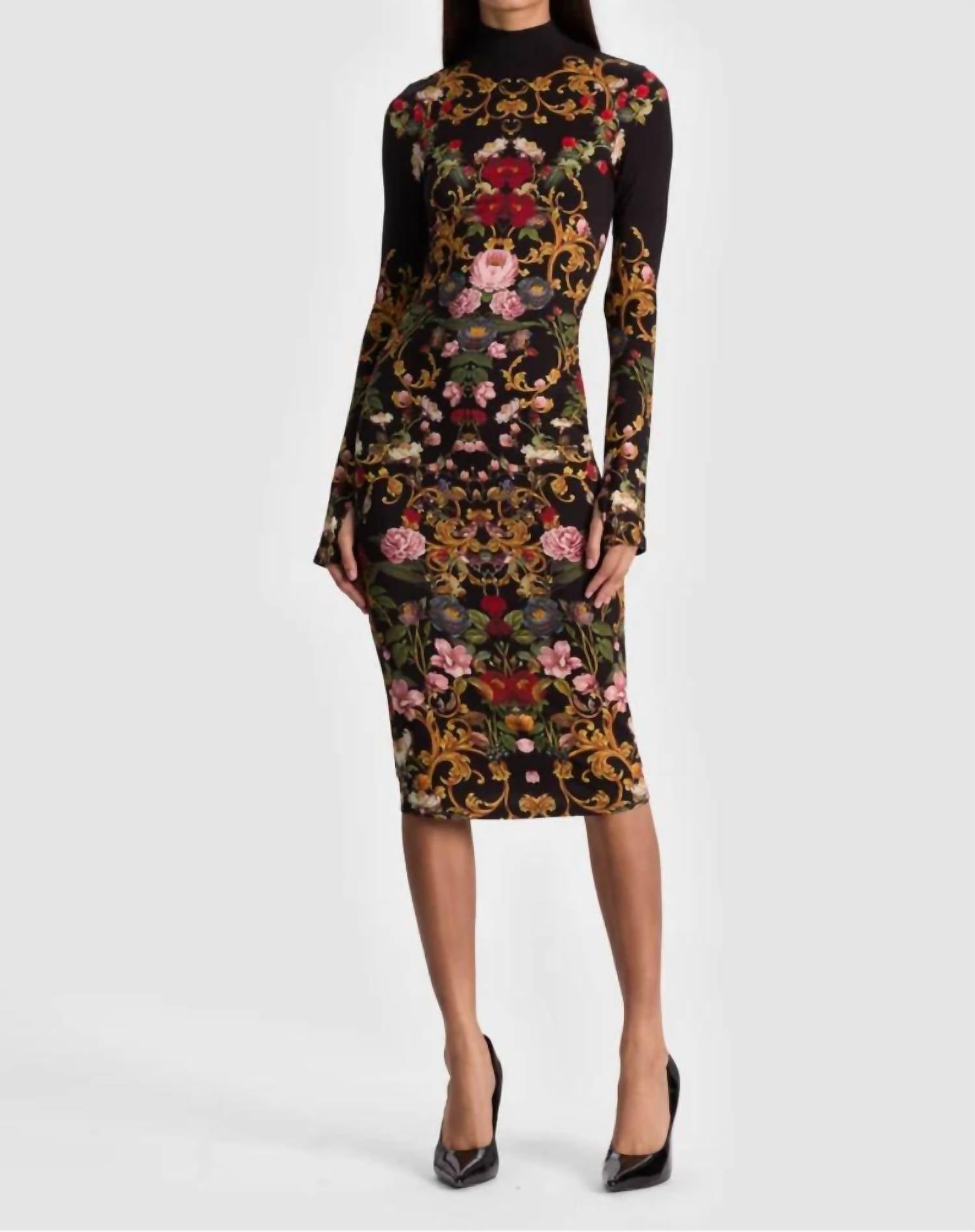 The perfect length dress does exist. Introducing the Alice & Olivia Delora Midi Dress in Evermine, a captivating addition to any wardrobe with its vibrant floral pattern. This bodycon dress features a sleek turtleneck and long sleeves with thumbholes, crafted from 97% viscose and 3% elastane for a snug fit. With a midi length of 45 inches, it's designed to elegantly contour your curves. Made with a back zip closure, this dress should be dry-cleaned to maintain its pristine condition, perfect for a boho chic look at a dinner party.