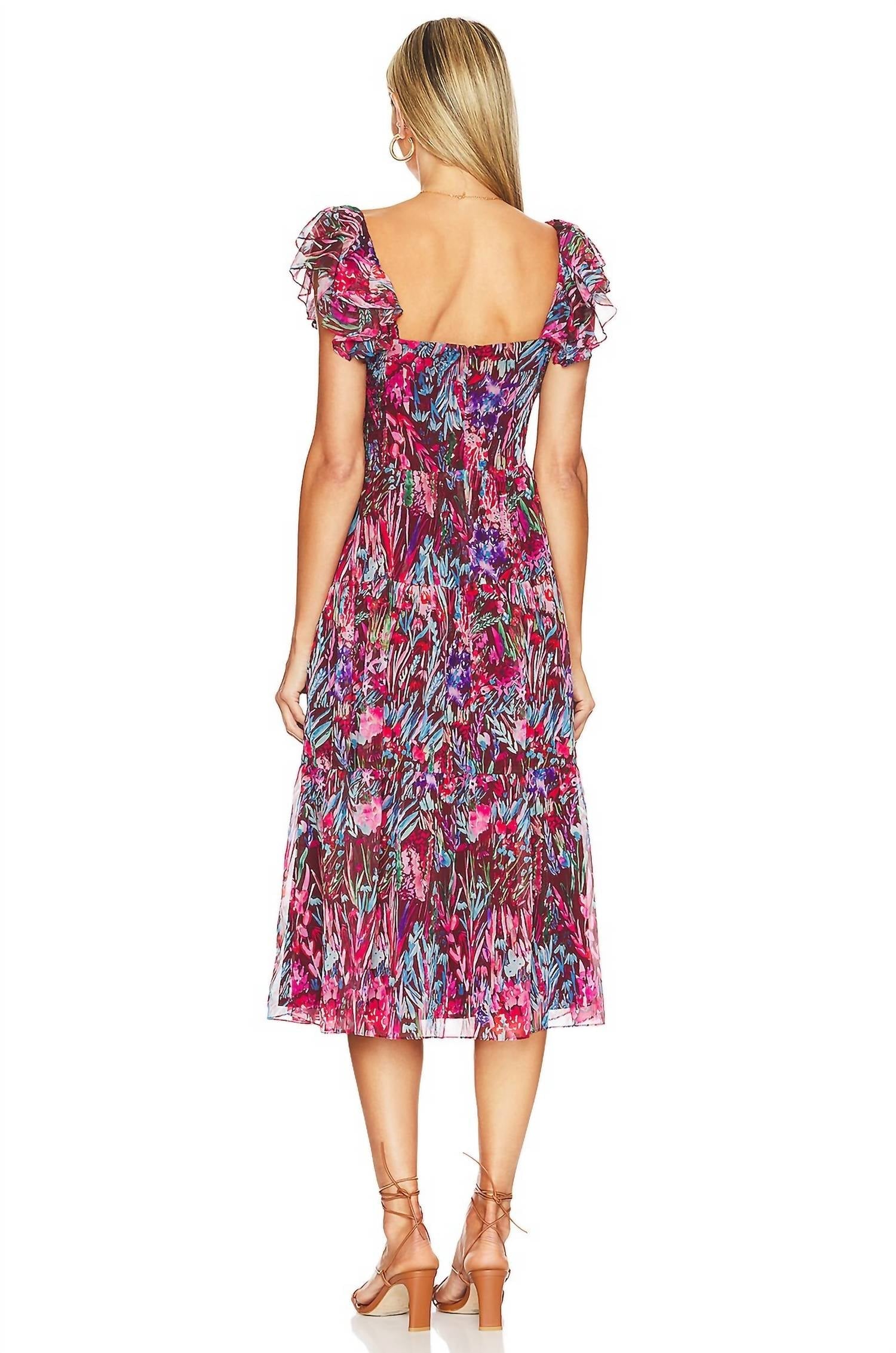 The perfect length dress does exist. The Francia Dress by Amanda Uprichard is an elegant midi dress designed to flatter in a beautiful Bloom hue. Crafted from a viscose blend, this floral-patterned dress features flutter sleeves and a contoured bust. It is fully lined and features a hidden back zipper closure for a seamless finish. Dry clean is recommended to maintain its pristine look.