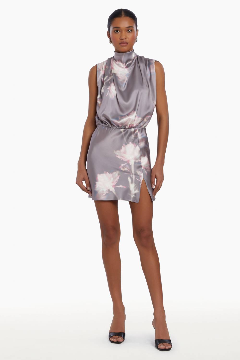 Indulge in the Franny Mini Dress by Amanda Uprichard, the perfect choice for an elegant dinner party. This sleeveless shift dress boasts a charming soft cowl neck with a tie back, presenting a Grey with Pink floral print that embodies quiet luxury. Crafted from 100% polyester, it offers a relaxed pull-on closure for effortless wear. Designed for a romantic evening or spring occasion, this dress promises both comfort and style.