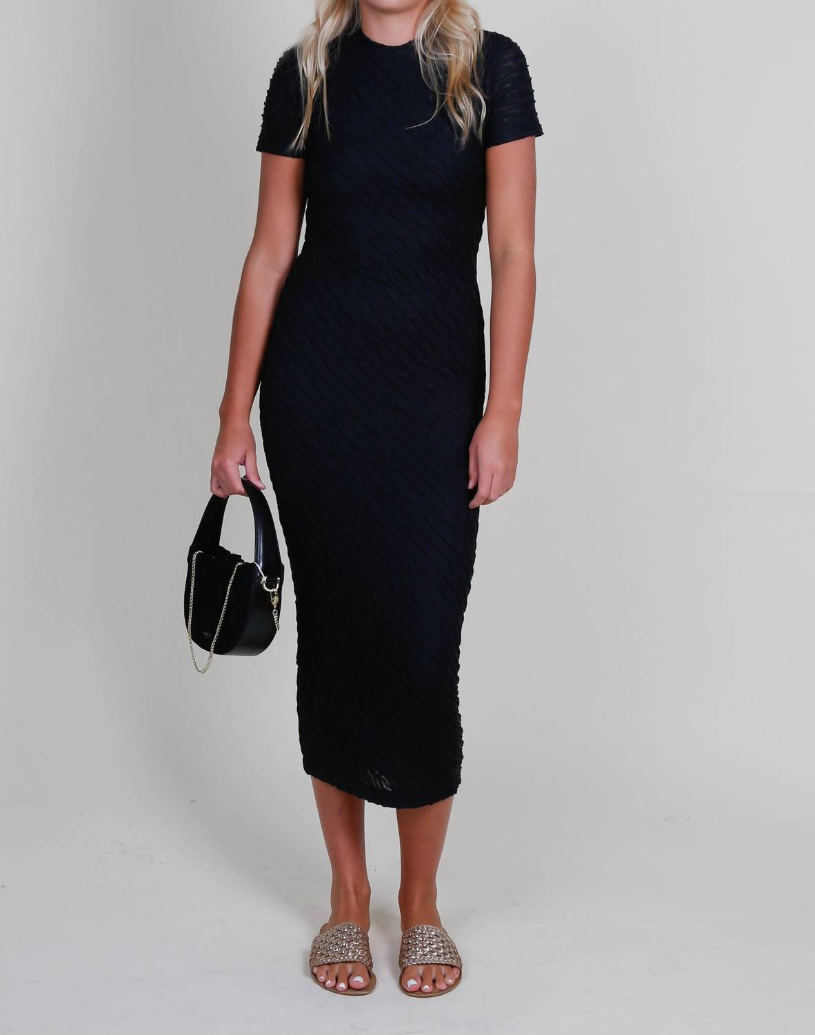 Just add slides or mules and you are good to go. Introducing the Rosaria Dress by Amanda Uprichard, a stunning piece crafted for both elegance and comfort. This black bodycon dress is composed of a luxurious blend: 48% viscose, 29% polyester, 19% polyamide, and 4% elastane, and features a textured jersey finish that enhances its curve-hugging silhouette. Designed with short sleeves and a modest crewneck, this American-made midi dress measures 57 inches in garment length and effortlessly slips on with a pull-on closure. Care is simple with machine wash instructions, making it an easy addition to your wardrobe.