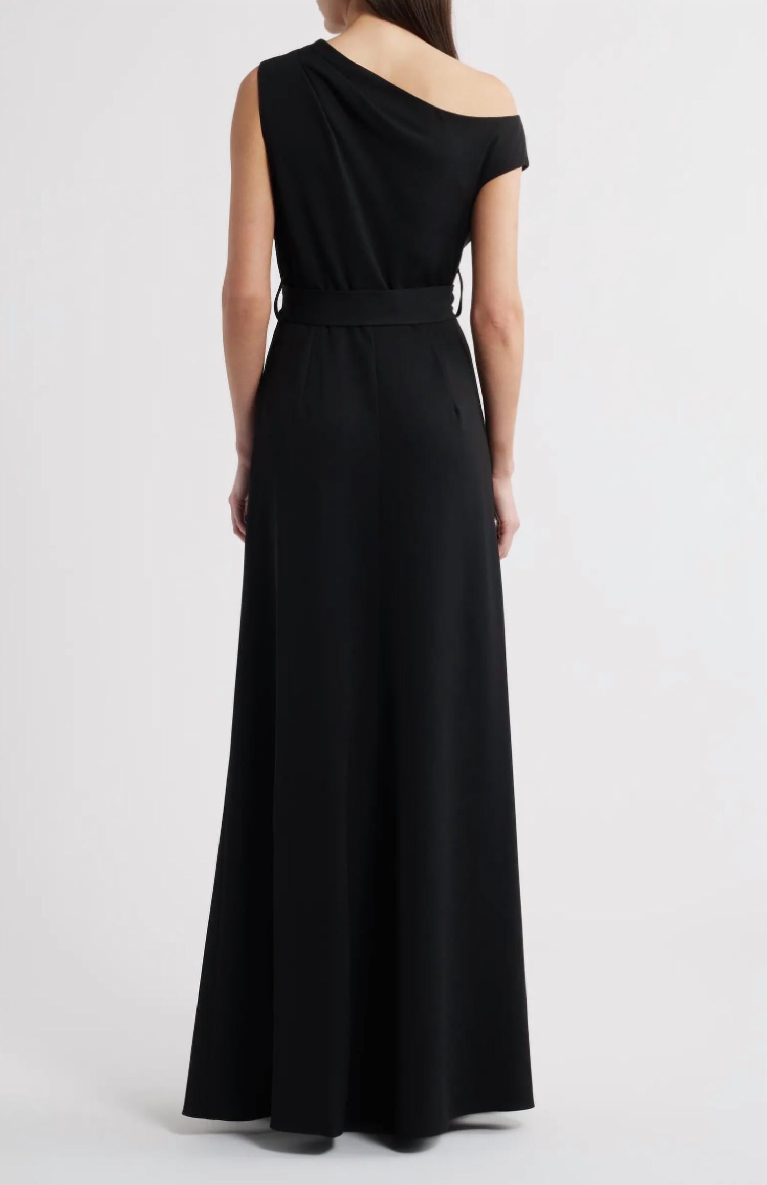 Nothing wrong with a little shoulder action. The Black Halo Caprina Gown embodies sophisticated elegance with its one-shoulder design and graceful A-line silhouette. A single cap sleeve complements the 62" length of this striking gown, crafted in the USA from 100% polyamide. The hidden side-zip closure and a removable belt add practicality and style, perfect for a dinner party or Thanksgiving celebration. To maintain its pristine condition, this gown requires dry cleaning.