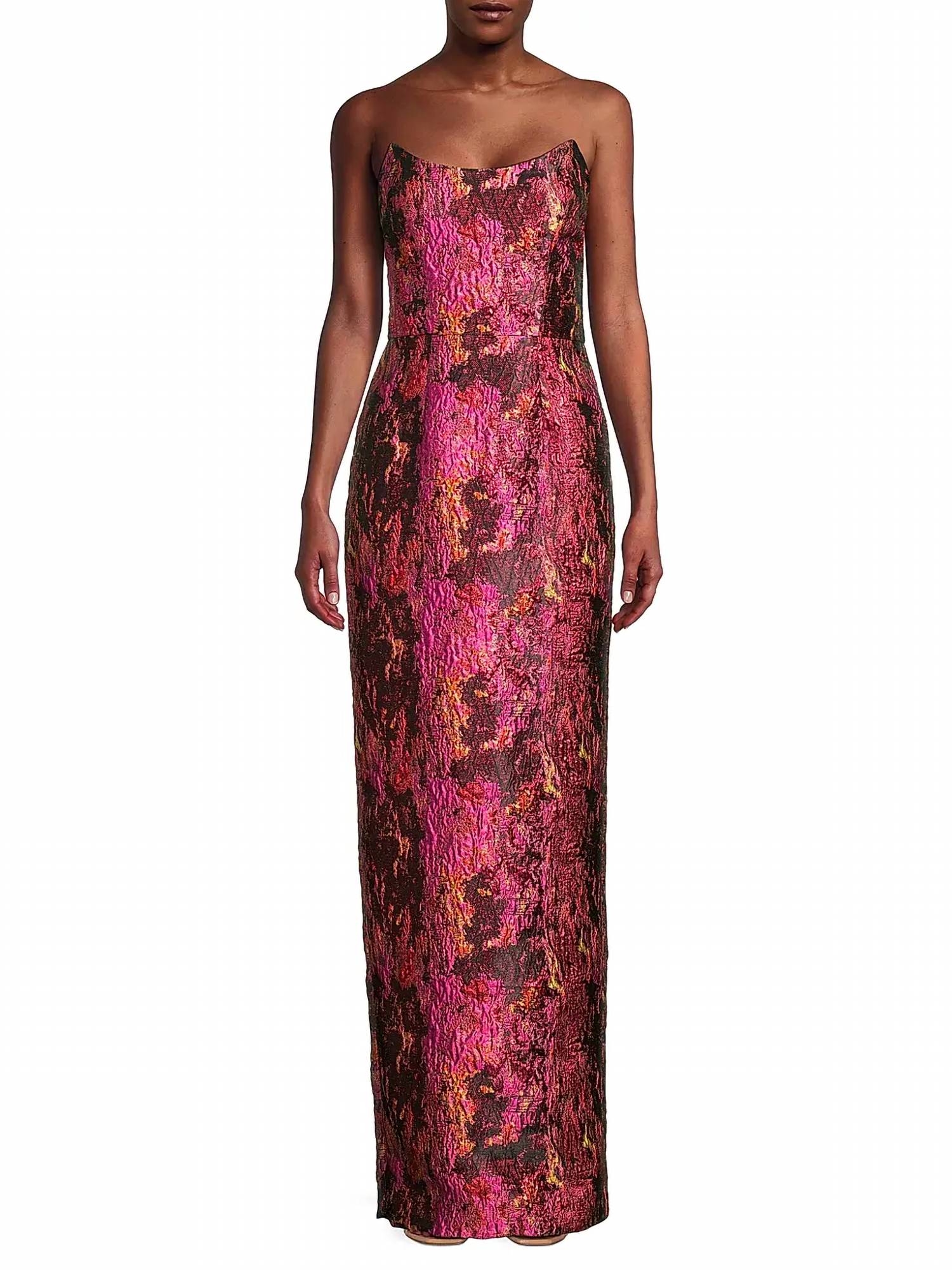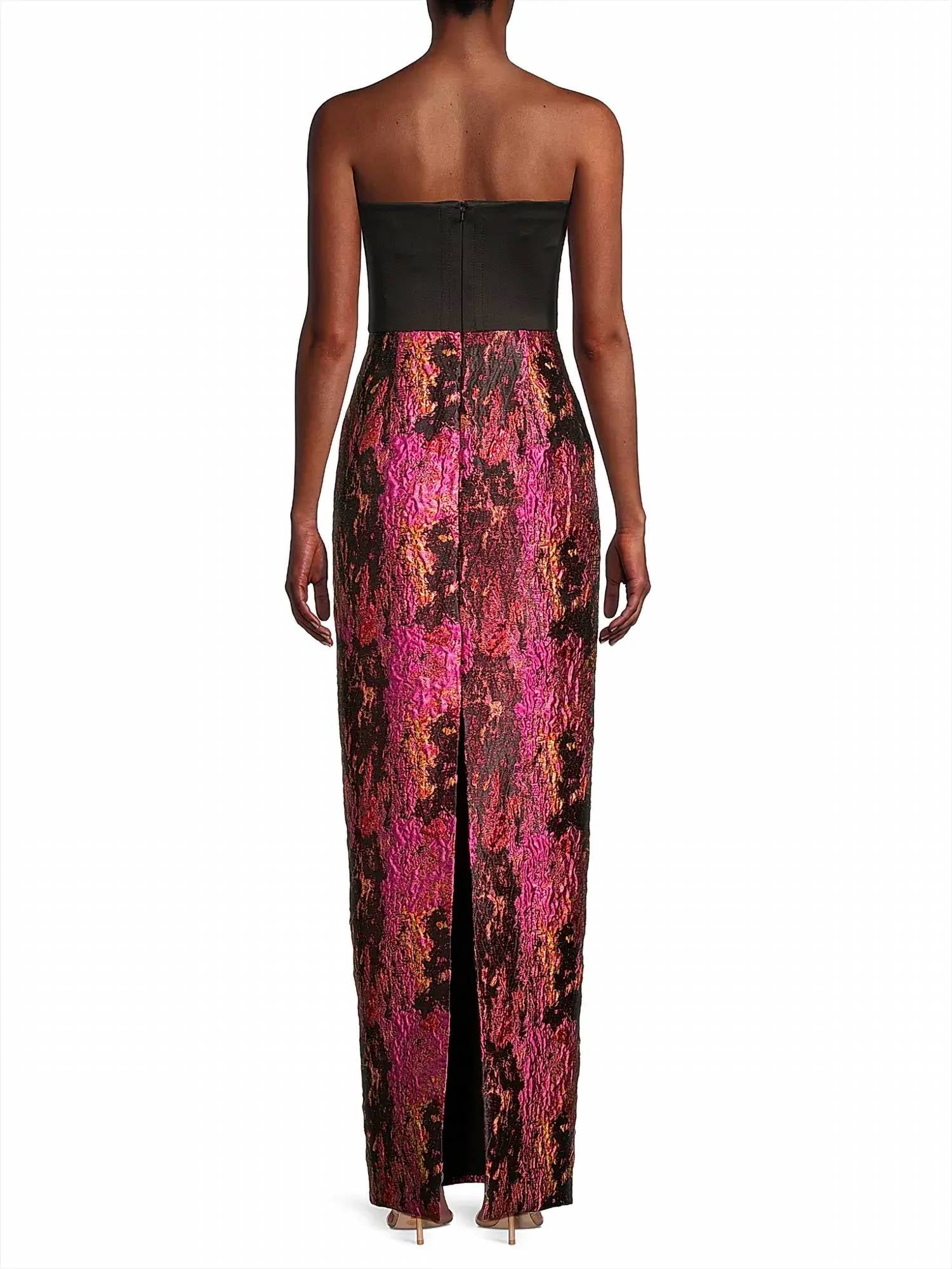Elevate your formal wardrobe with the Lumina Jacquard Strapless Maxi Gown by Black Halo, crafted in the opulent Opal Storm colorway. This strapless gown is elegantly composed of 91% polyamide and 9% metallic fibers, featuring a sheath silhouette with a chic back slit for graceful movement. Made in the USA from imported fabric, this gown offers a hidden back-zip closure for a seamless fit. Care for this luxurious piece with dry cleaning to maintain its exquisite quality.