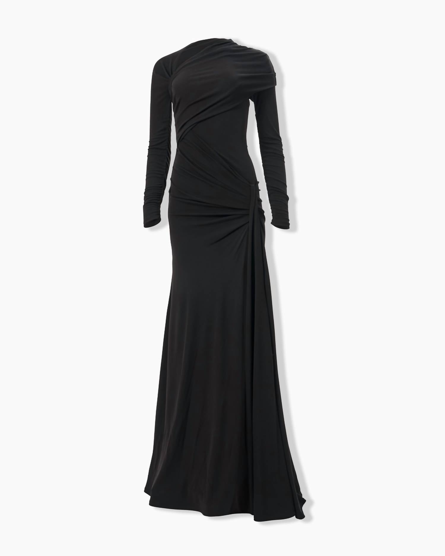 A flattering yet comfortable dress you'll be reaching for season after season. Make a statement with the Long-sleeved Draped Gown by Carolina Herrera, perfect for elegant occasions and minimalist fashion lovers. This stunning bodycon piece features long sleeves and an asymmetric neckline, complemented by elegant ruching and a thigh-high slit for added allure. Crafted from an 80% acetate, 20% nylon blend and made in Italy, it ensures both style and quality. Closure: Concealed zip fastening at back. Care: Dry clean only.