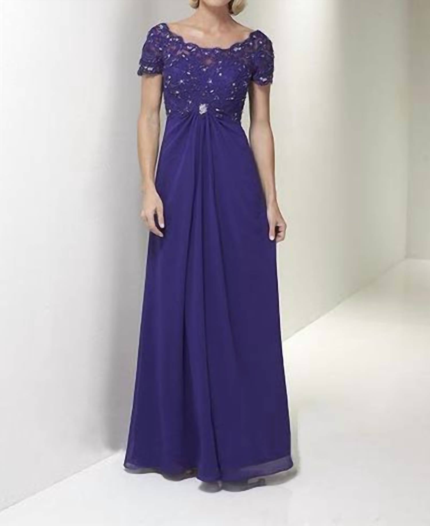 Designed for the bride who values understated elegance. Its classic design and perfect fit make it the ideal choice for your special day. Say yes to the dress! The Christina Wu 17769 evening dress features a lace bodice with a V-back design. It has a sweetheart neckline with an illusion scoop and short sleeves. The dress is made of corded lace with crystal accents. The waist is decorated with a crystal brooch, and the skirt is floor-length made of soft chiffon with gathered fabric that flares out.