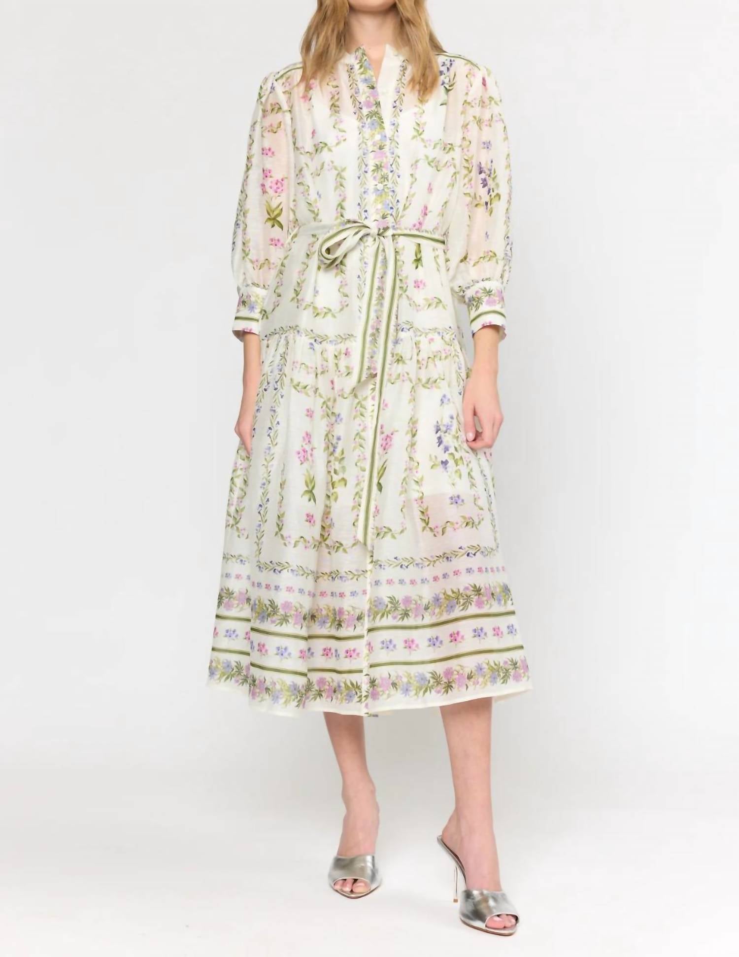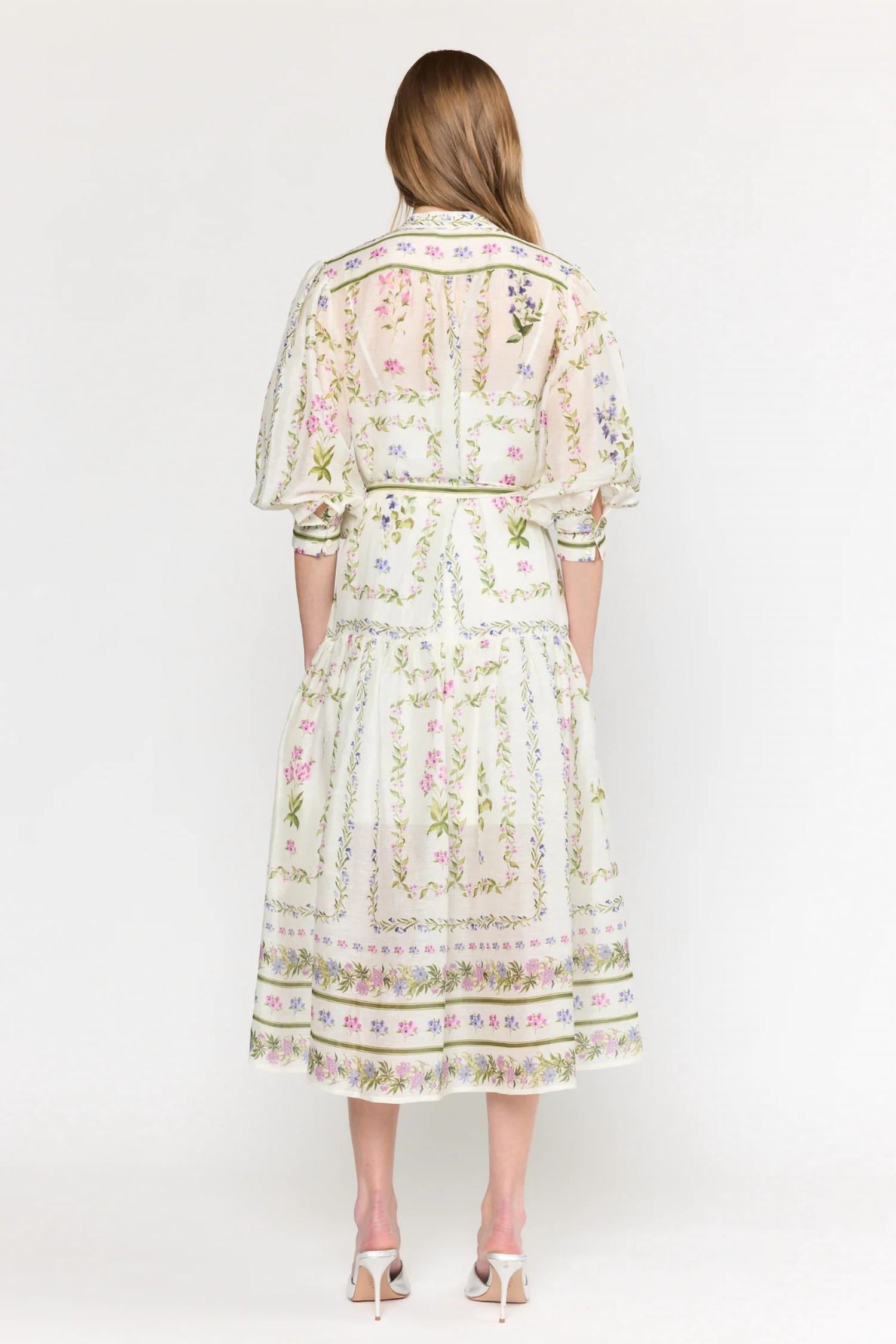 Just add slides or mules and you are good to go. Discover the Blake Midi Dress by CHRISTY LYNN, a piece that embodies elegance and sophistication in Mosaic Ivory. This dress showcases three-quarter sleeves with a wide cuff, crafted from a luxurious blend of 65% Linen and 35% Silk Organza. The midi-length silhouette, complete with a button closure, features beautiful placed artwork throughout, perfect for your summer gatherings. Originating from an imported design, this versatile piece can be styled as a dress or worn open as a duster, and should be dry cleaned only.