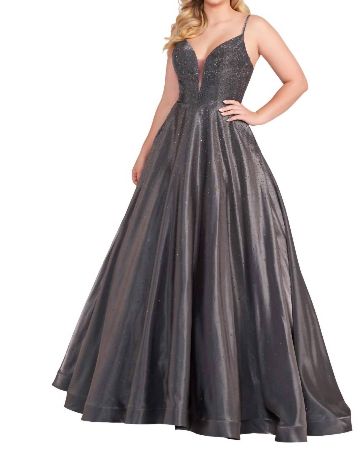 Just add a cute little clutch and a matching heel for the perfect event look. Step into the spotlight with this exquisite A-line ball gown, crafted from sumptuous jersey and shimmering metallic fabric for a touch of radiant elegance. Featuring a graceful V-neckline and delicate straps, the design beautifully frames the décolletage, while a corset lace-up back ensures a perfectly tailored fit. The flowing skirt extends into a dramatic train, creating a captivating silhouette that's ideal for any unforgettable occasion. Embrace refined glamour and confidence in this stunning formal gown.