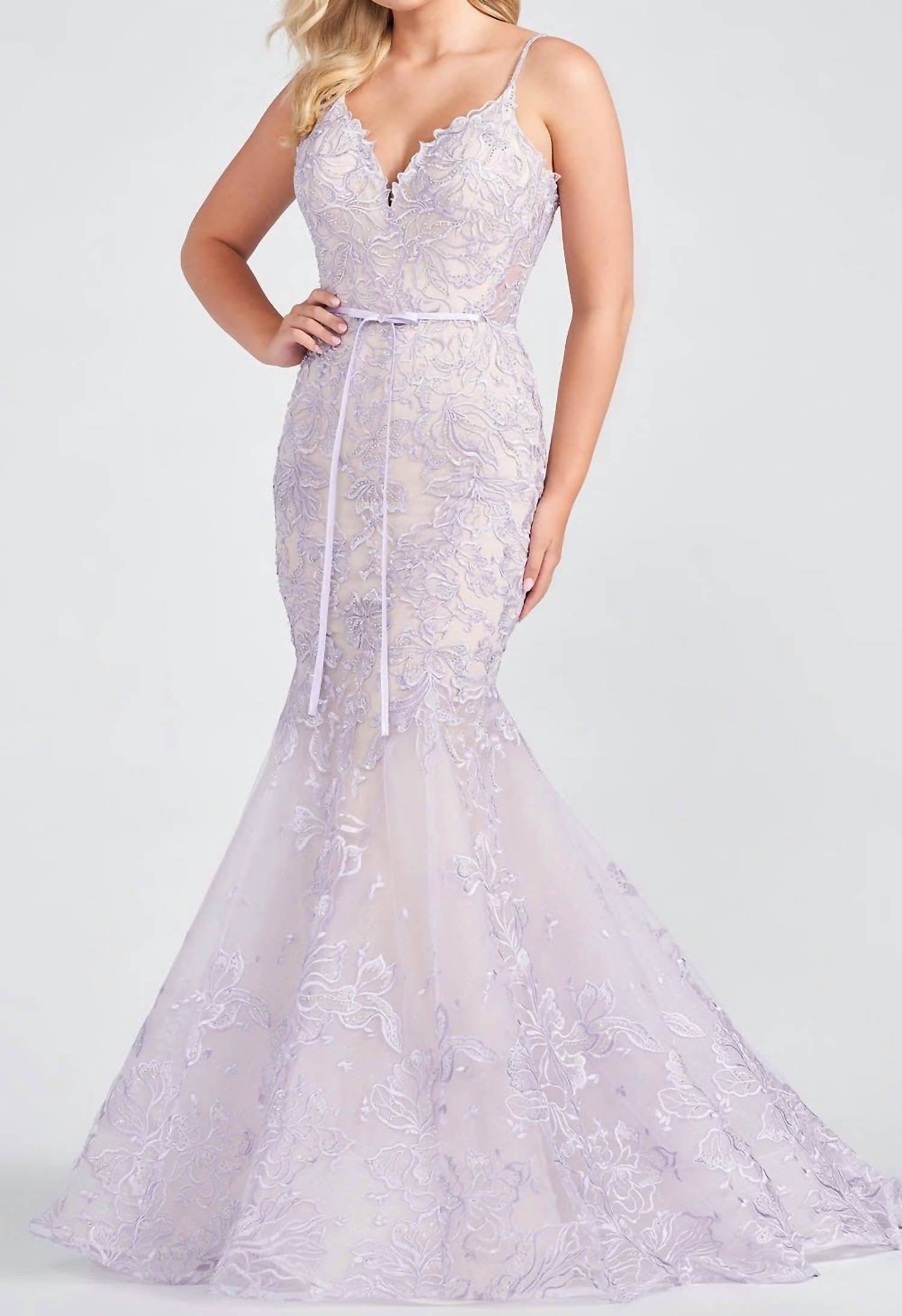 Just add a cute little clutch and a matching heel for the perfect event look. Make a dramatic entrance in this elegant gown, exquisitely embroidered with delicate floral details. Featuring a plunging V-neckline with slender straps and a midrise back, it offers a timeless yet alluring silhouette. The luxurious skirt flows gracefully, revealing floral accents as it cascades into a sweeping train. Perfect for your most special occasion, this gown is designed to captivate and enchant.