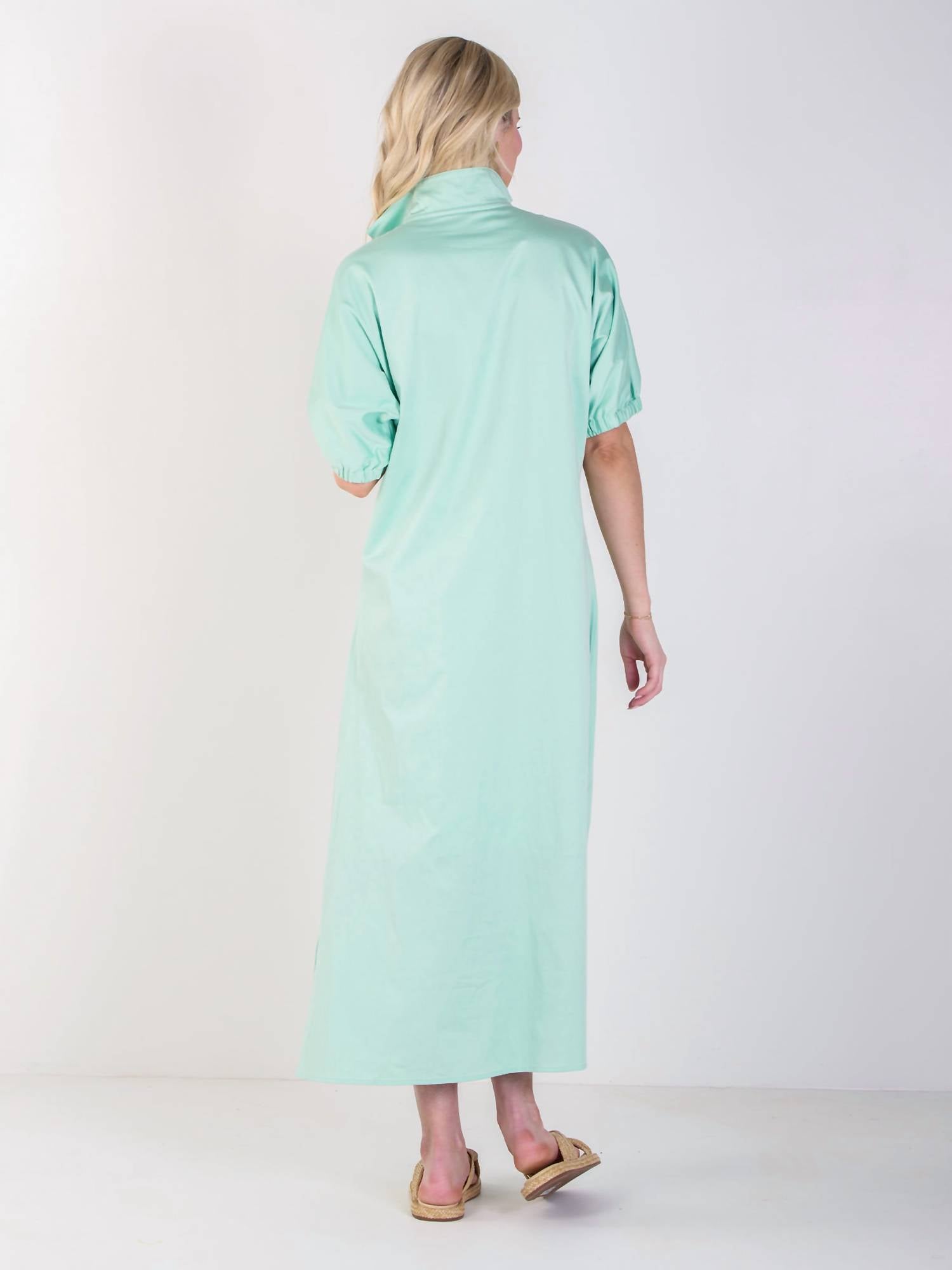 The Poppy Maxi Dress by Emily McCarthy is your essential vacation piece, providing both style and comfort in Mist Green. Featuring elbow-length loose elastic dolman sleeves, this relaxed A-line silhouette is made from a crisp cotton blend for a touch of ease. Composition: 98% Cotton, 2% Spandex with a 100% Polyester lining. Closure: Pull on. Care: Machine wash on delicate cycle with cold water and gentle detergent; line dry to maintain color and shape. Ideal for those minimalist spring outings, this solid-color dress keeps you effortlessly polished.